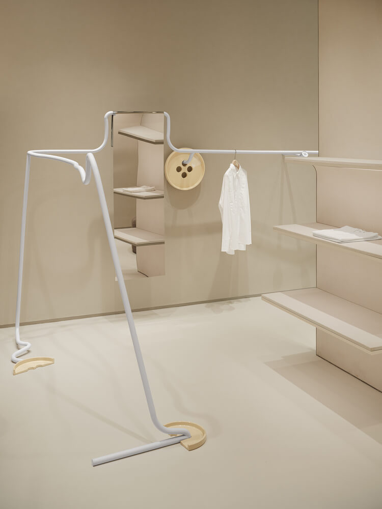 Then spread across the interior, adding a playful vibe to the space, are fashion elements including colorful stitching on cuffs added to the seating areas and large buttons displayed on the walls and on hanging poles. There’s also a large button-shaped cushioned seat and zipper-shaped handles in the doors of the minimalist fitting room.