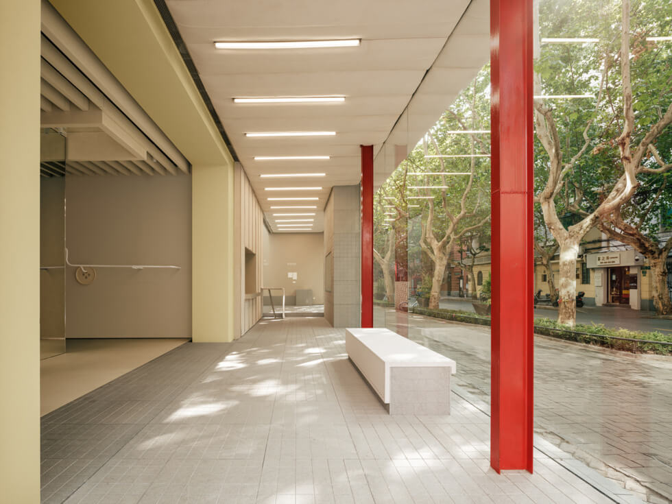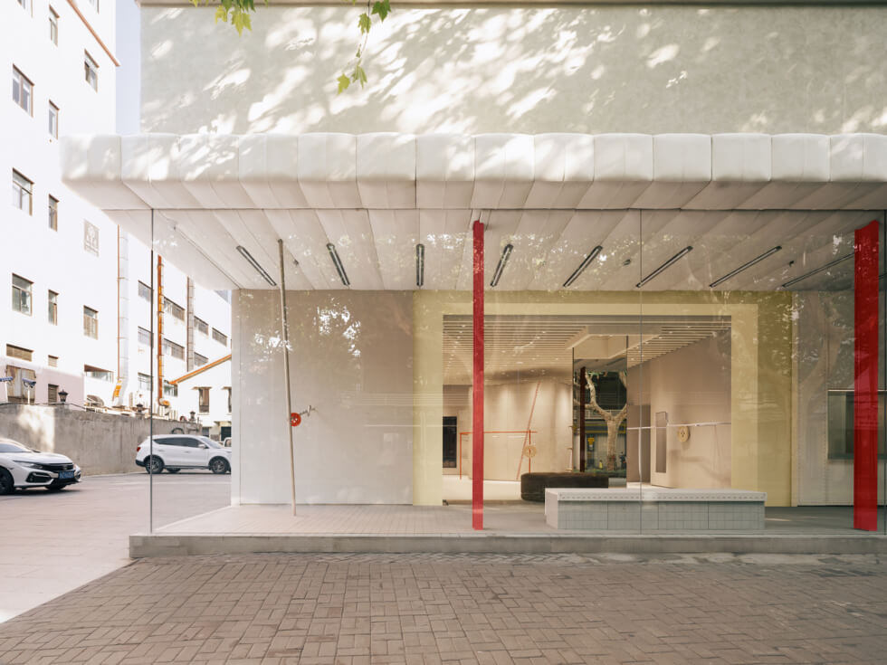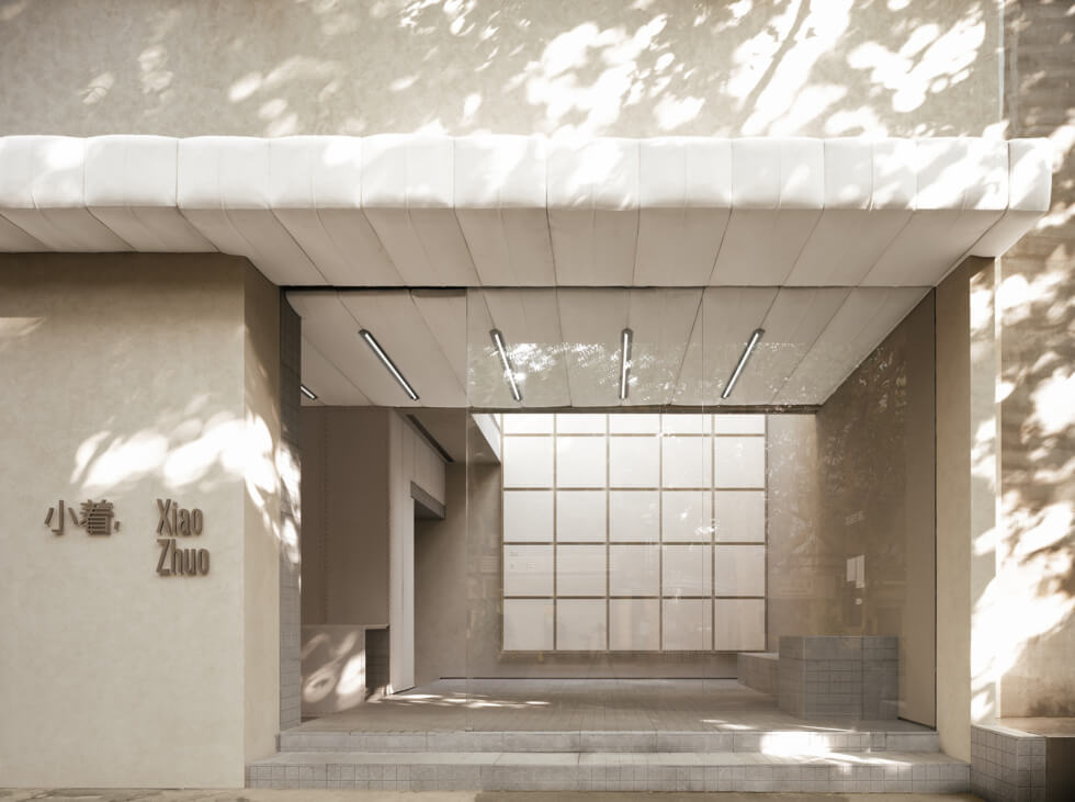 The architects placed a new glass front facade on Xiaozhuo for natural light to seep inside the store and give urban commuters a glimpse inside the creative space. They also extended the roof from the inside to the outside to create a small pavilion that hosts the seating area positioned near the glass windows.
