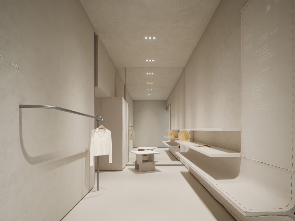 Tschumi’s theory attributes architecture as a dynamic combination of events and space, wherein events can disrupt the balance between the architectural form and its intended functions, which in turn could lead to “de-familiarity.” Taking this in mind, the team used architectural elements that deconstructed the brand’s identity and the garment-making process. Instead, opting for an eventful and recognizable space with aesthetic forms. The outcome is a shop that combines commercial space and public and leisure space.