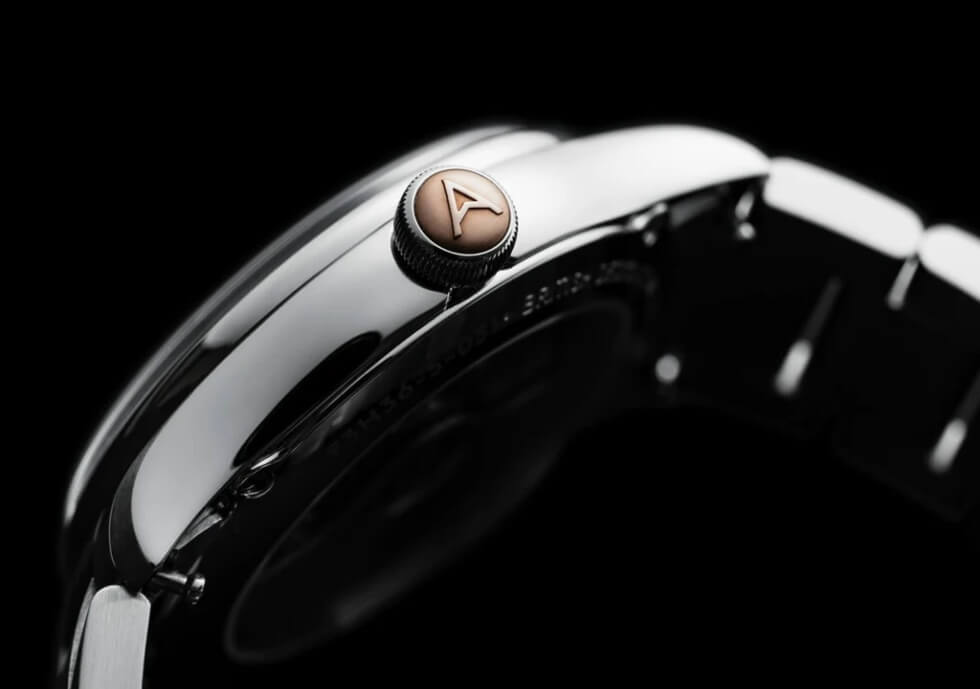 Second, the interplay of the polished and brushed finishes can create a mesmerizing shimmer when the light hits. Sapphire crystal protection covers both ends with an internally applied anti-reflective coating for superior visibility. A stainless steel crown is capped in solid bronze with the brand’s “A” emblem embossed on top.
