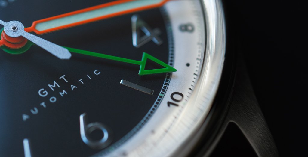 The first thing that caught our eye is the matte black dial and the multi-color setup of its hands. Since this is a GMT dual-time + date automatic model, an extra pointer is there to keep track of the other time zones. The hour and minute hands sport an orange rhodium coat with a Super-LumiNova filling. Next, the second hand is mostly in white with a sky blue skeleton tip in the shape of the brand’s emblem. Finally, the GMT hand is likewise fashioned with a cutout on the business end and coated in green, which is a clever touch.