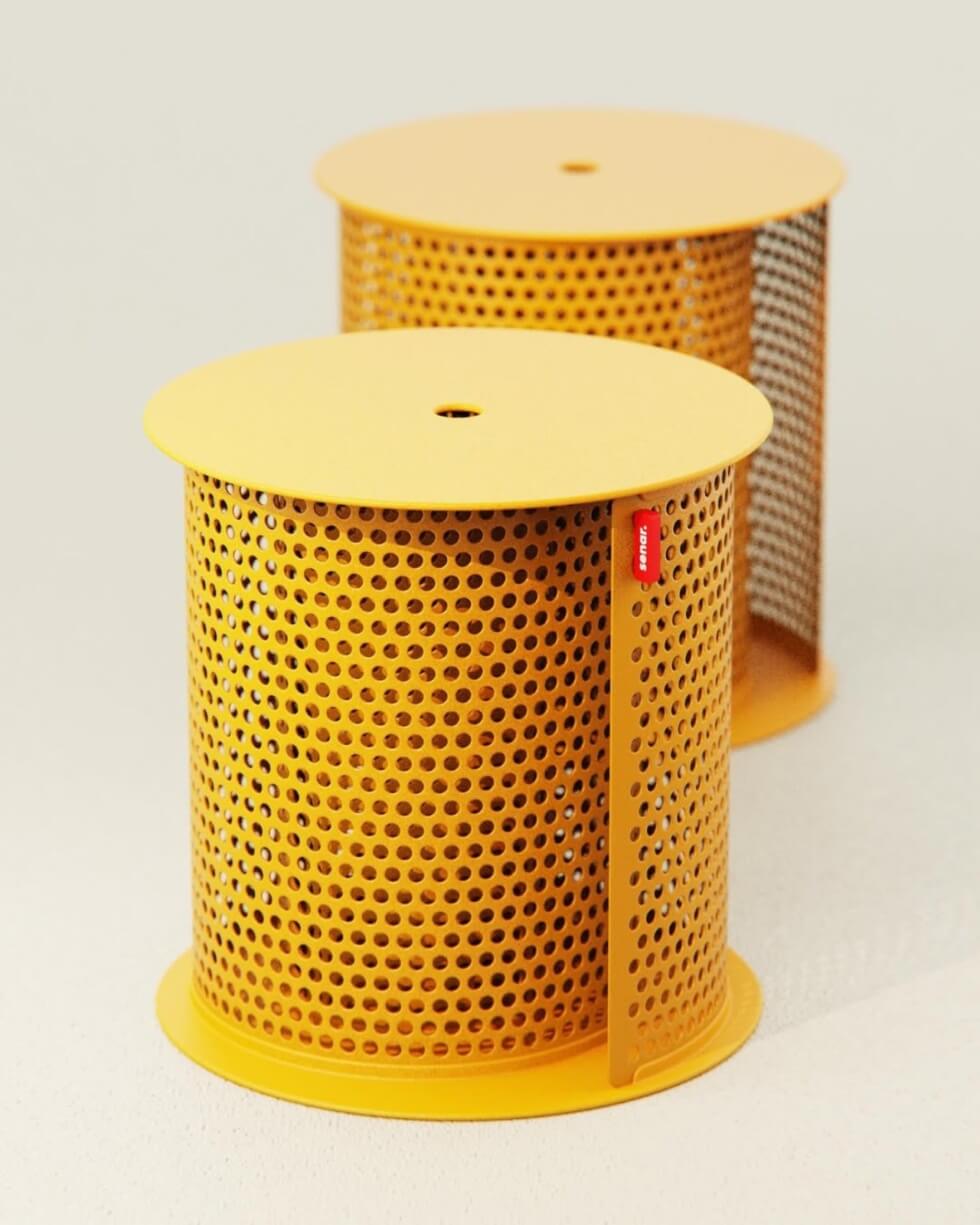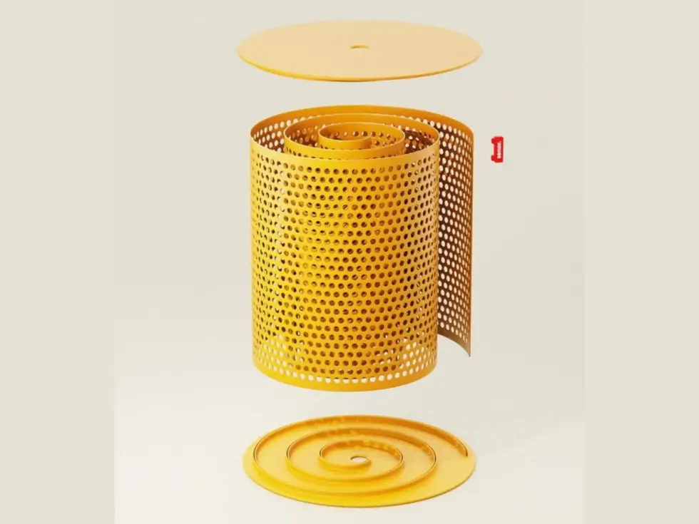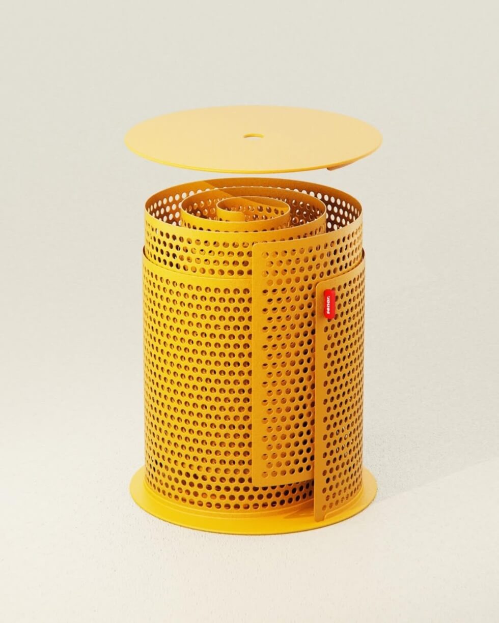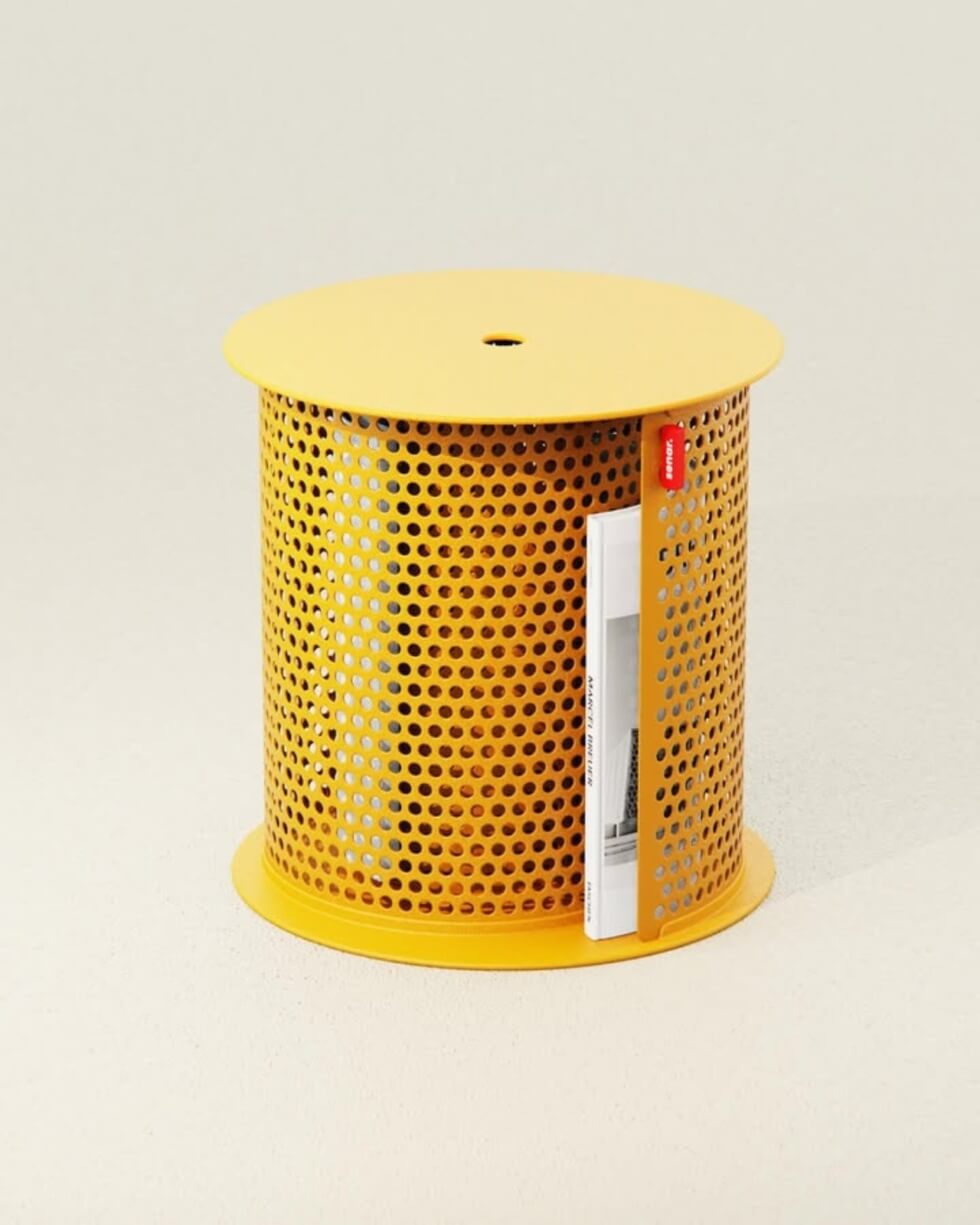 Made entirely from sheet metal, the “beautifully engineered” coil-formed body locks into place as it forms. Despite the lack of screws or weld points, it is sturdy enough to hold various things and even to sit on. Meanwhile, its geometric form with round holes along with the monochromatic yellow finish add a pop of color to any interior setup.