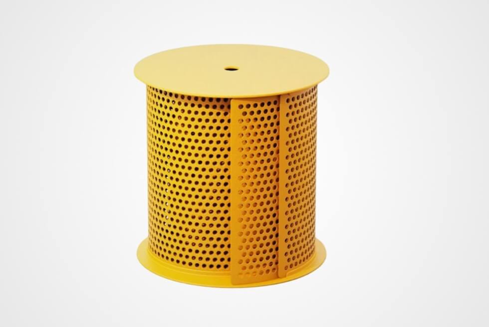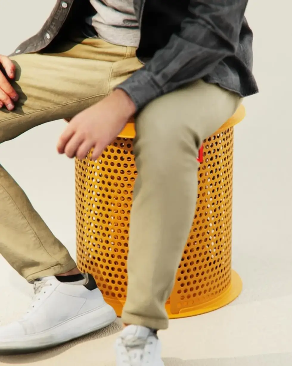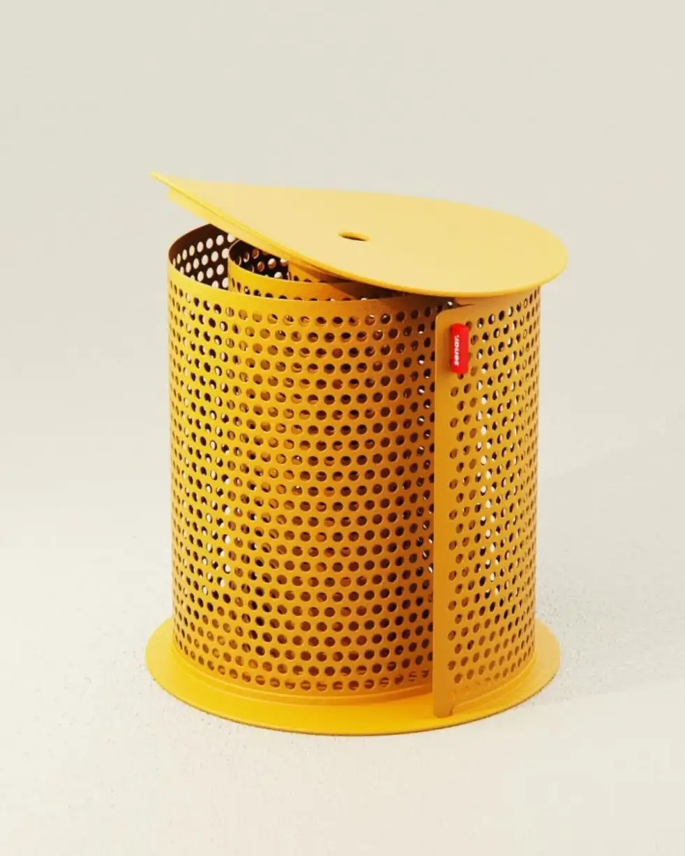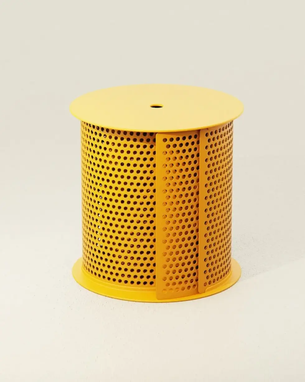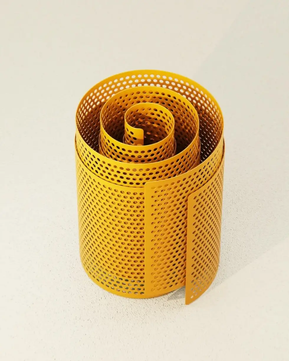 Made entirely from sheet metal, the “beautifully engineered” coil-formed body locks into place as it forms. Despite the lack of screws or weld points, it is sturdy enough to hold various things and even to sit on. Meanwhile, its geometric form with round holes along with the monochromatic yellow finish add a pop of color to any interior setup.