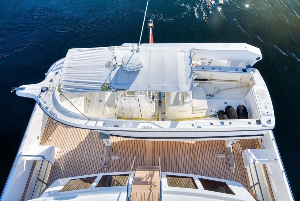 Yes, this 36-year-old watercraft features teak fighting chairs, fishboxes, an ice chipper, rod stowage compartments, livewells, and more. The Ice Bear is propelled up to 15 knots by twin Caterpillar 3512 TA engines at 1,175 bhp each. Up to 10 guests can enjoy thrilling battles against legendary pelagic species or just observe the action from above.