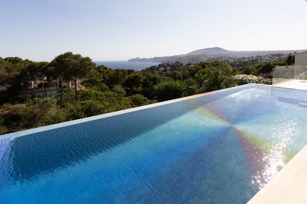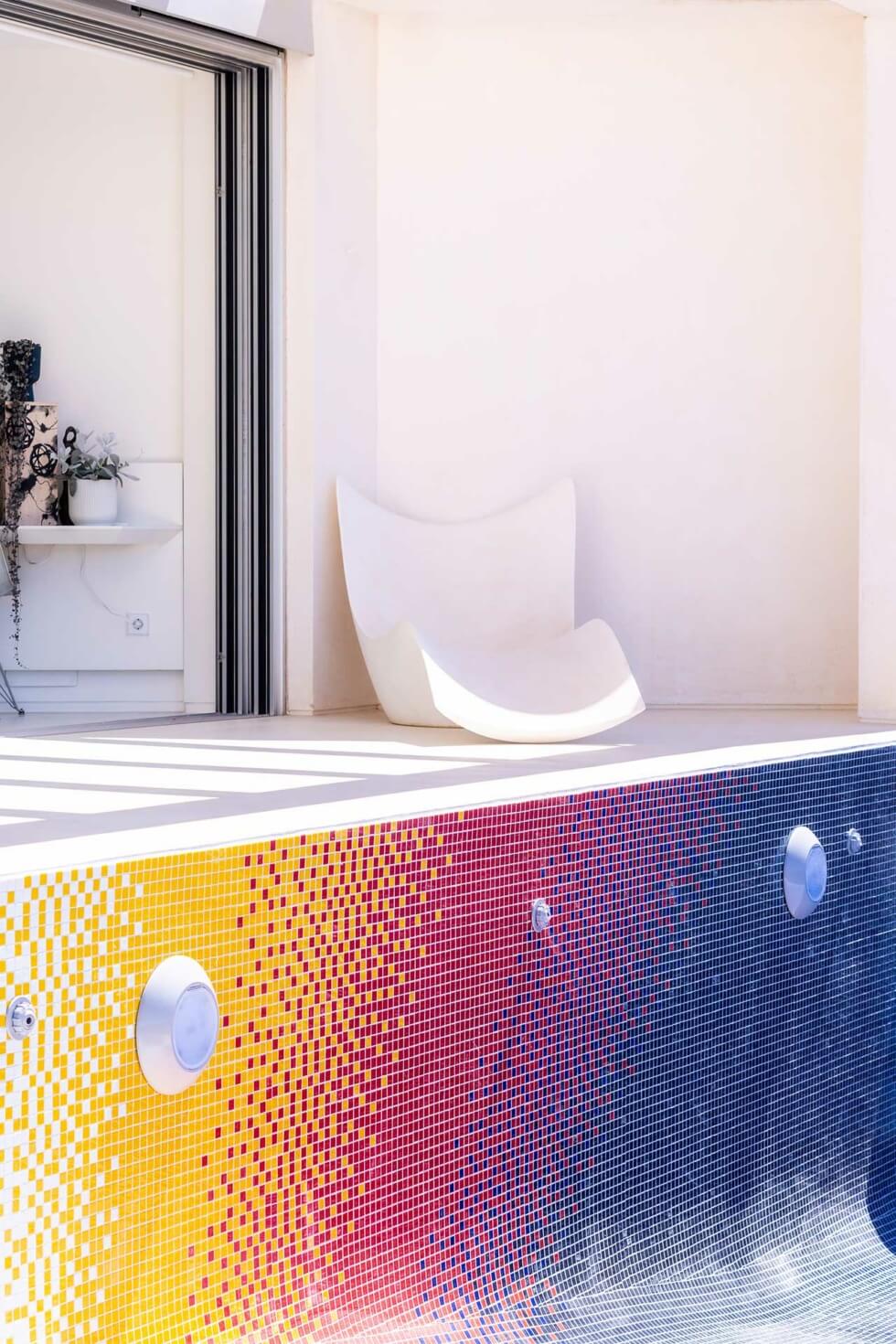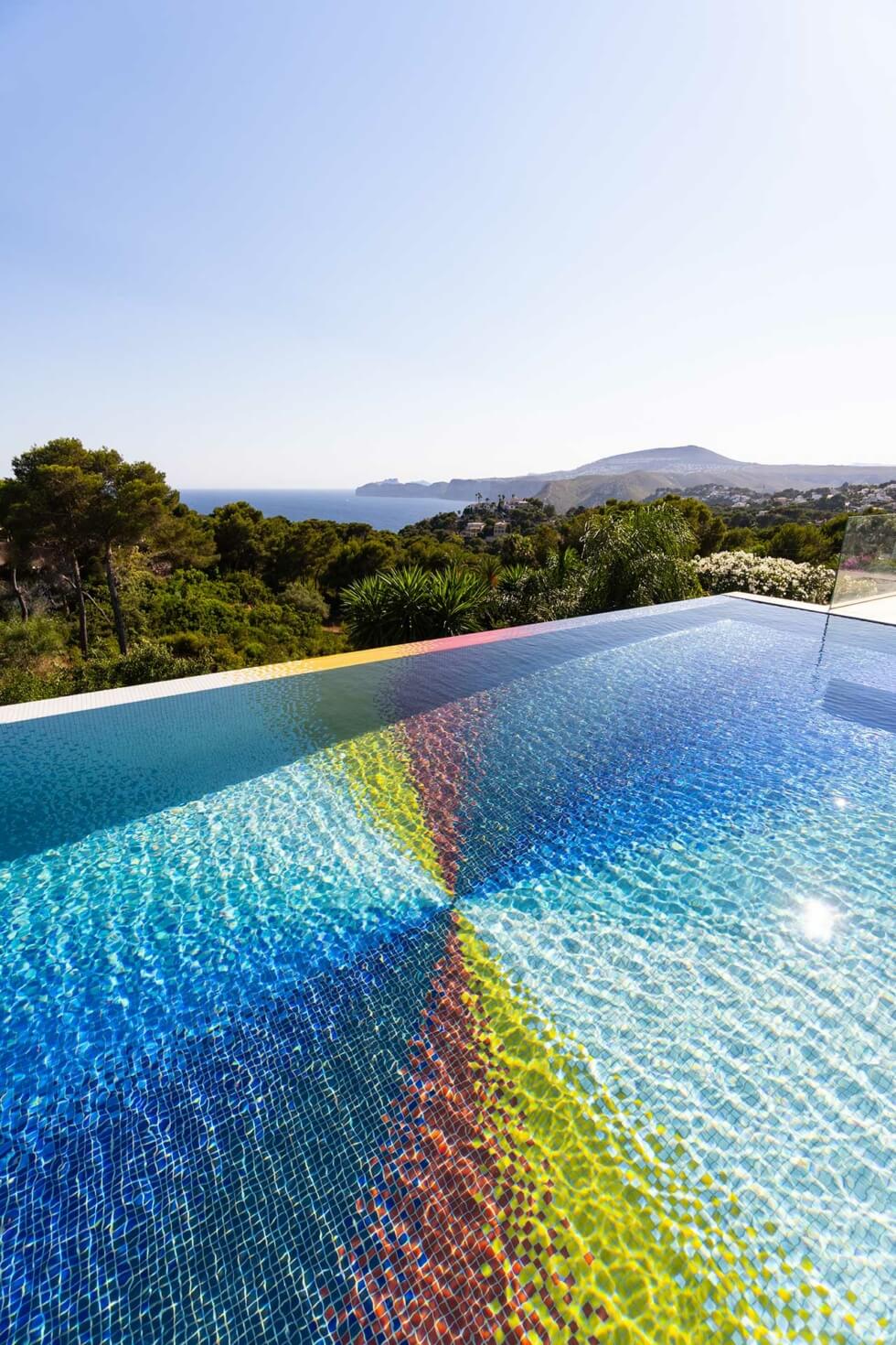 Moreover, the vibrant colors also stand out against its minimalist backdrop. The pinwheel adorned what could have been a boring, utilitarian rectangular pool at an all-white home in Javea. The outcome is an infinity pool that adds a beautiful contrast and becomes the architectural centerpiece.