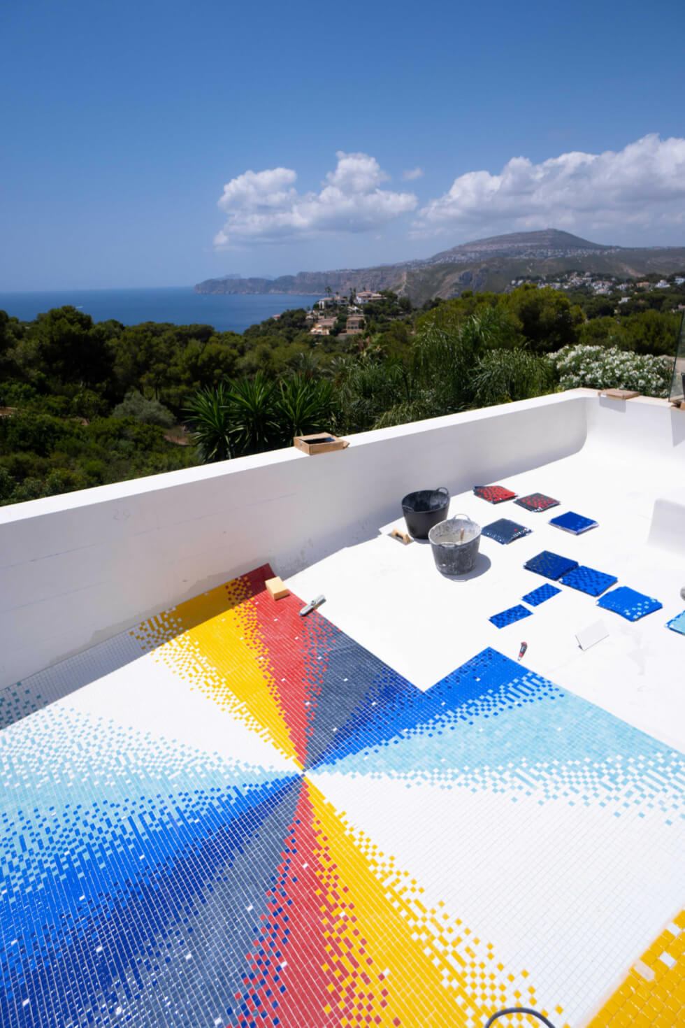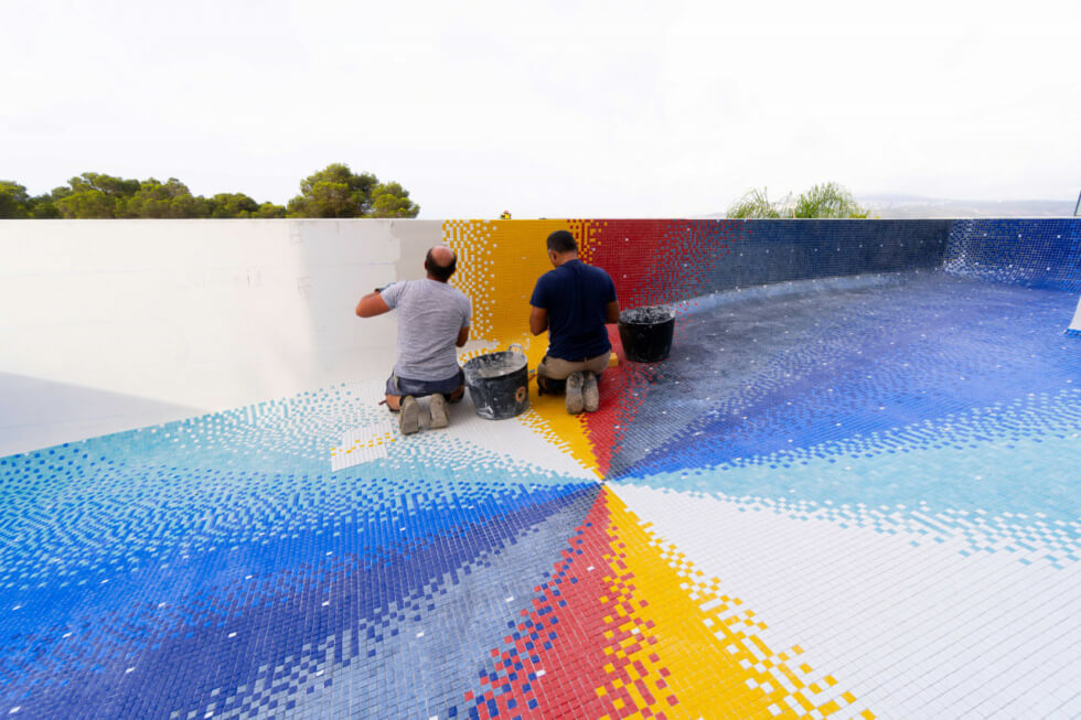 The artist, known for his chromatic, pixelated, and digitized glitchy artwork, teamed up with world-leading glass company ONIX to complete this stunning underwater masterpiece. He used 1″ ONIX mosaic tiles in seven colors to make a pinwheel out of an infinity pool at a home in Javea, Spain.