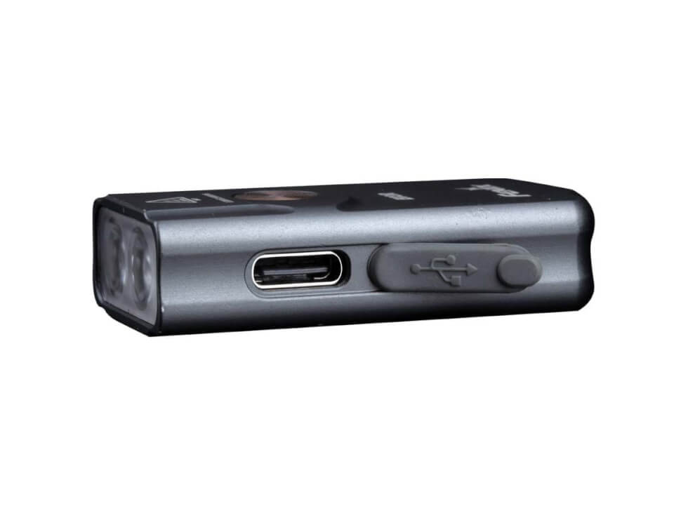 This mini flashlight comes with a switch on/off button and runs on a rechargeable 200mAh Li-polymer battery. It has a battery level indicator that tells you when the battery is low. It flashes red when the battery is low and green when it is full and uses a Type-C port for fast charging.