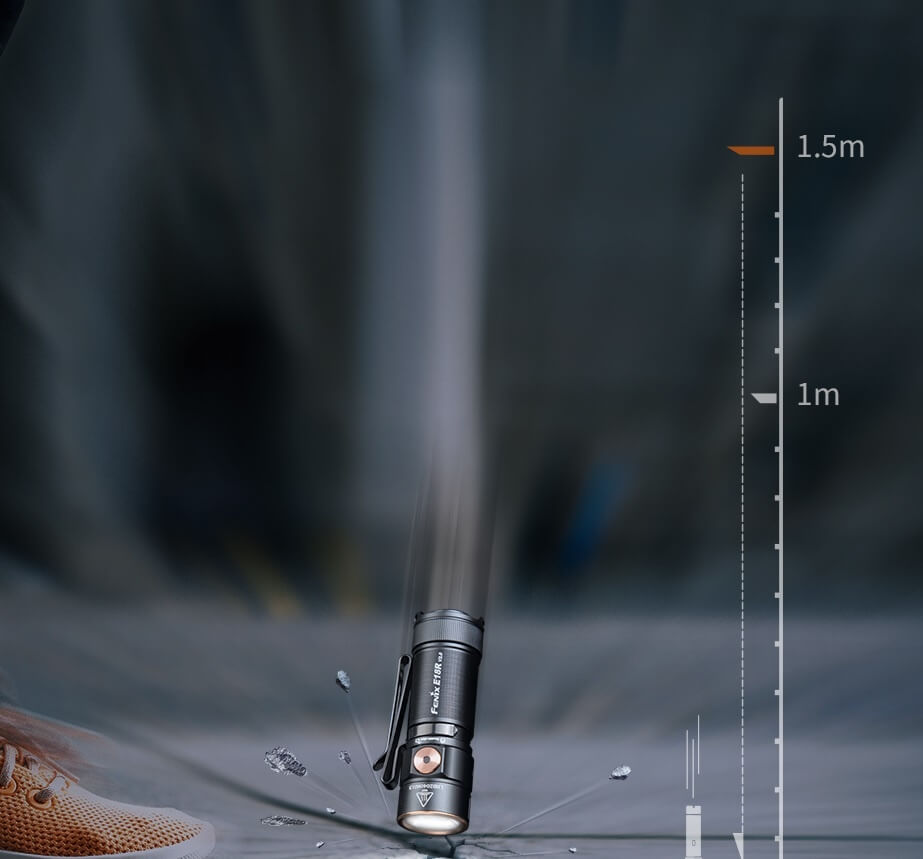 Moreover, the Fenix E18R V2 can survive ground drops of up to one meter and can withstand extreme environments. It is IP68-rated waterproof so it can withstand splashes, snow, dust, and salt, and is submersible in water up to 20 feet in 30 minutes. This makes this torch ideal for search and rescue missions.