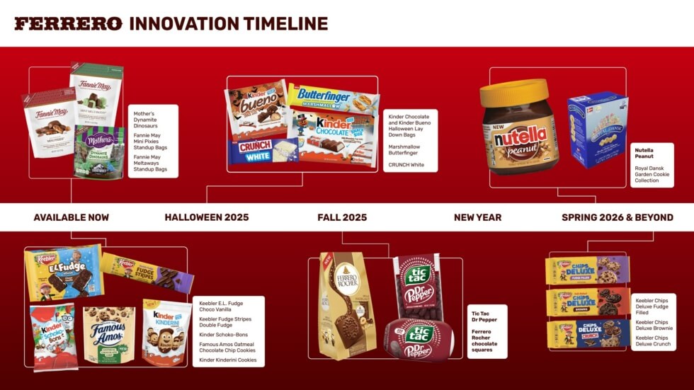 Nutella Peanut is set to hit shelves in Spring 2026. Among other flavor innovations headlining the Sweets & Snacks Expo 2025 include Ferrero Rocher chocolate squares with chocolate shell, creamy filling, and crunchy hazelnuts (available in stores in September 2025) and a unique Tic Tac flavor featuring the sweet flavor of Dr. Pepper (available starting Fall 2025).
