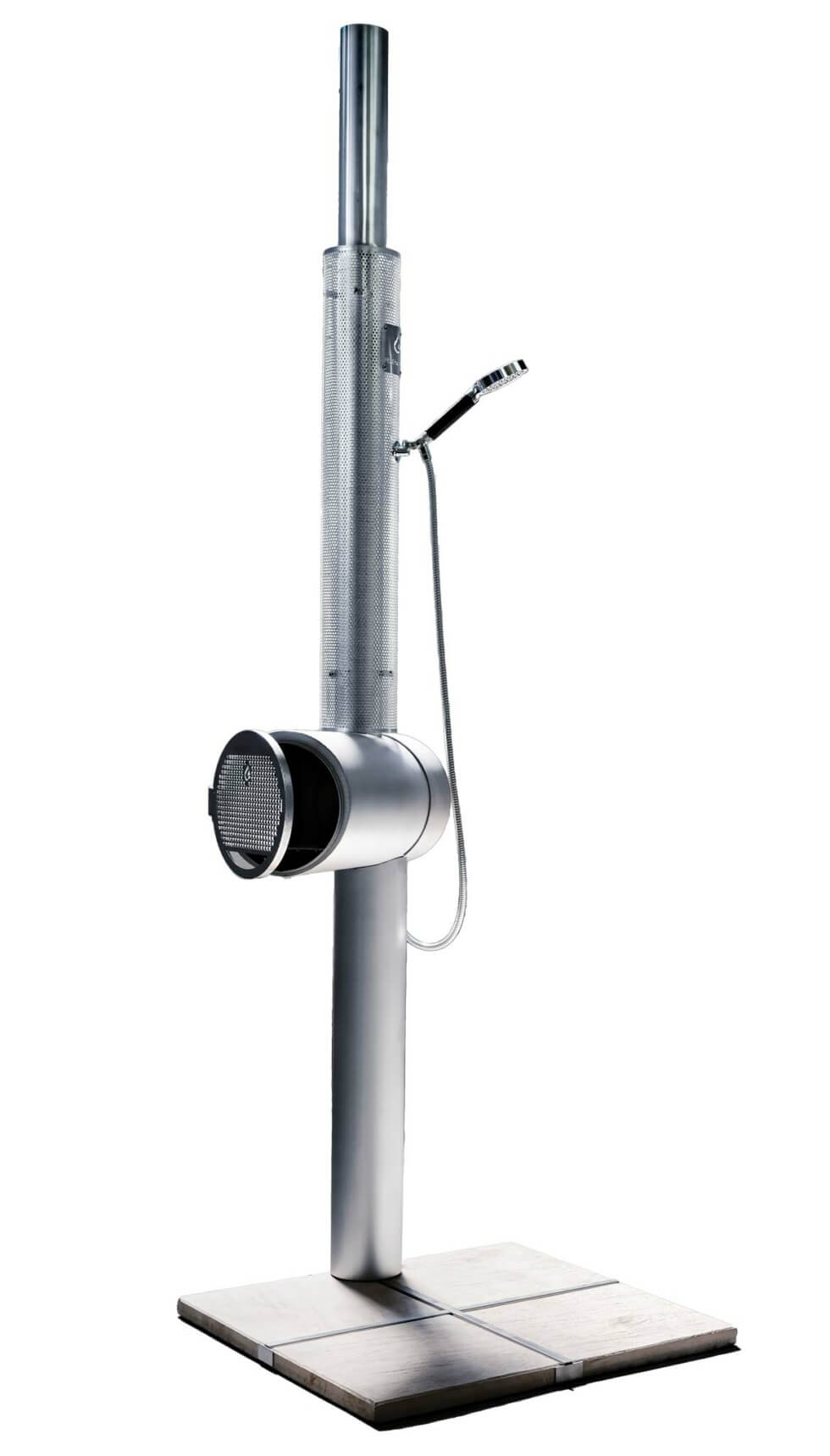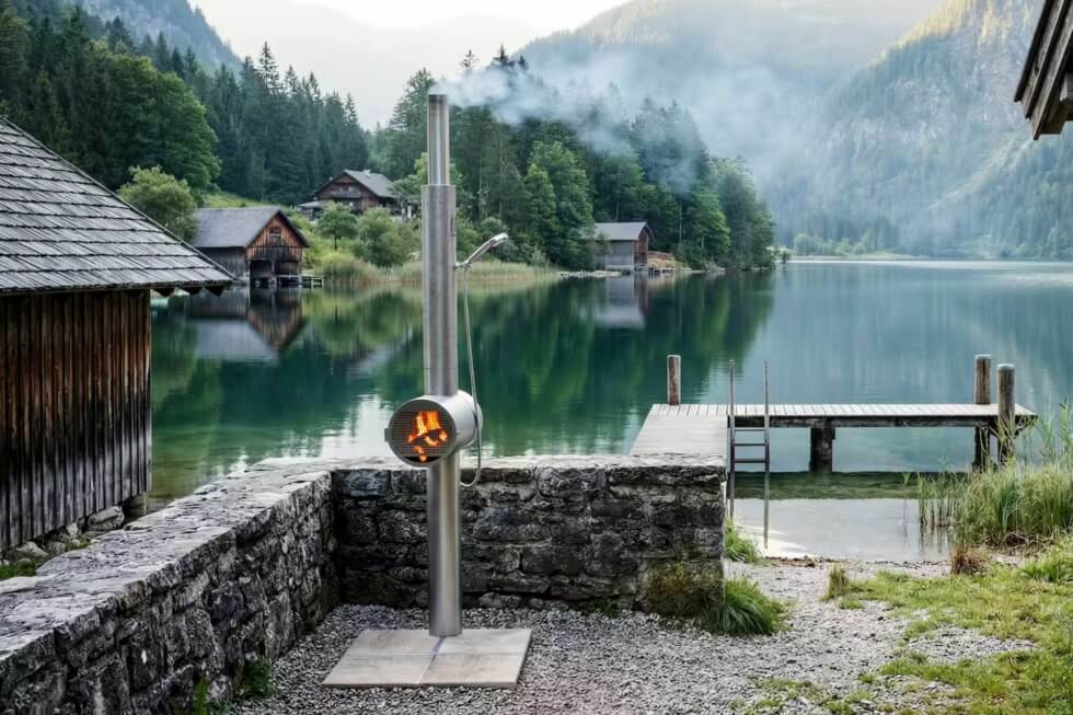 A mixing valve allows for temperature adjustments from cold to scalding hot. The Feuerwasser outdoor shower sits on a steel stand that stays stable using only stone slabs. There’s no anchoring involved, making the shower fully portable. It can stand on any outdoor setting, across backyards, gardens, mountain retreats, lakesides, and more.