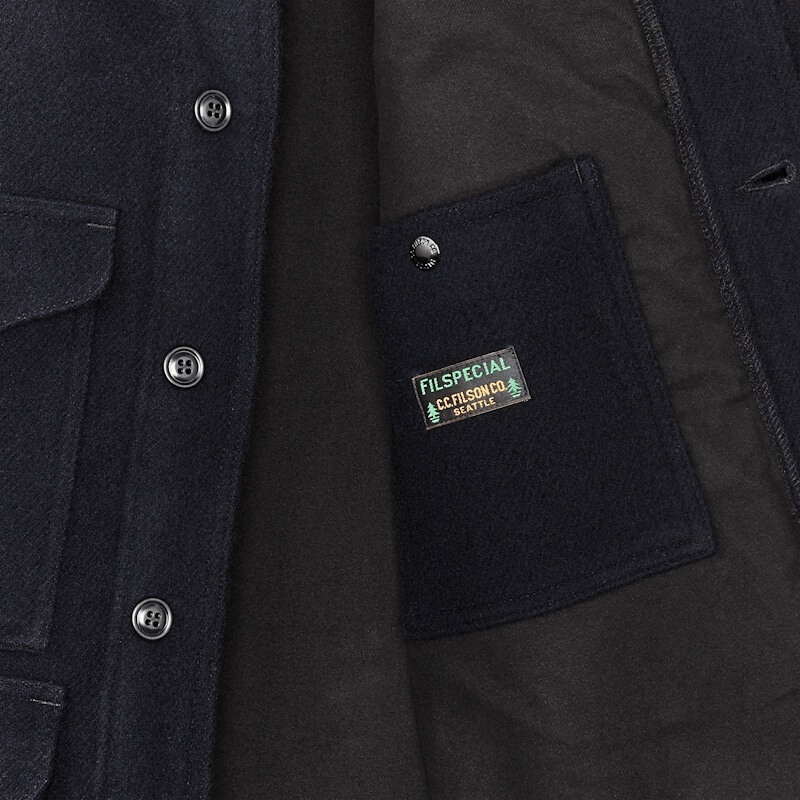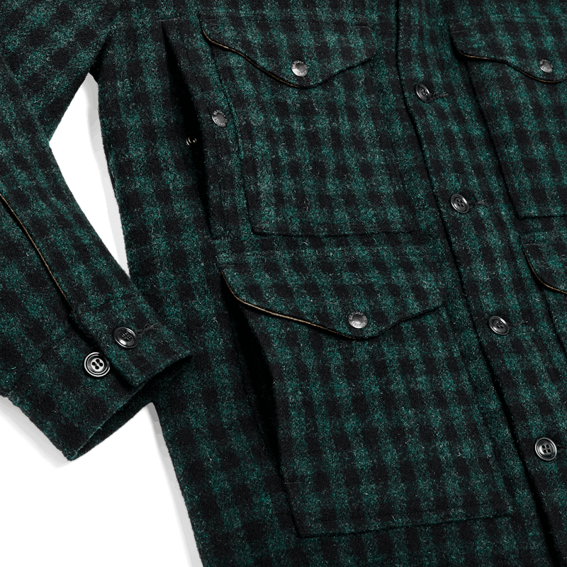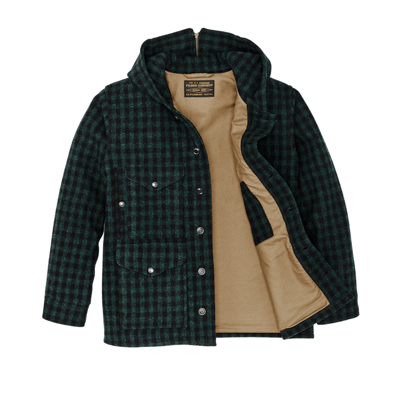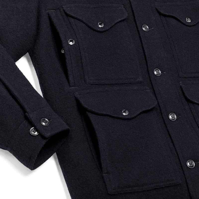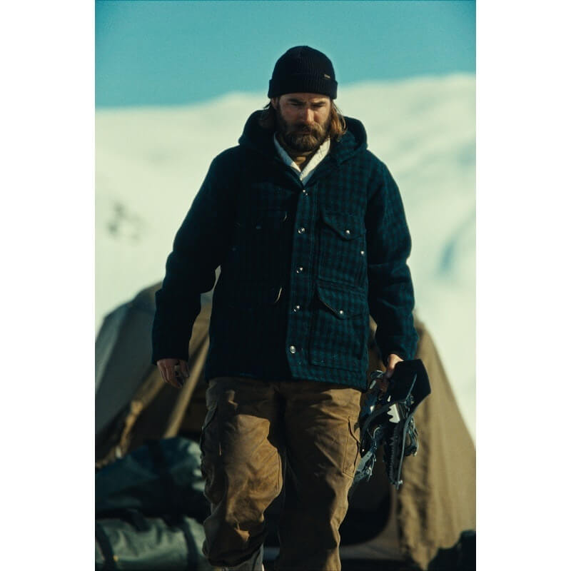 “Originally patented in 1914, the Cruiser Jacket was engineered for timber cruisers surveying ahead of logging crews. The pass-through rear pocket was where they stowed maps and survey charts, and is just as useful for bulky items such as watch caps and gloves,” writes Filson regarding the Mackinaw.