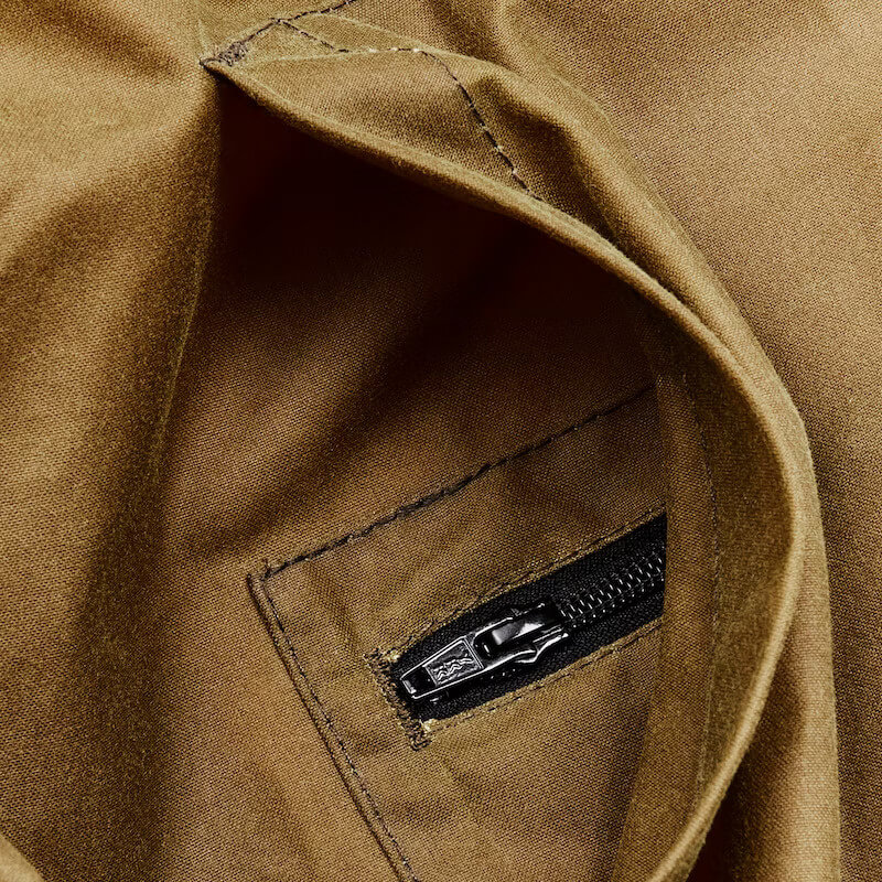 Filson’s Shelter Cloth Waxed Anorak also provides enough breathing room via the quarter-length front zipper that also offers wind and rain protection when zipped up to the chin. It also has a zipper garage to prevent pinching. Its forearms come with an additional fabric layer of reinforcement for added durability and feature snap-adjustable cuffs for a custom fit.