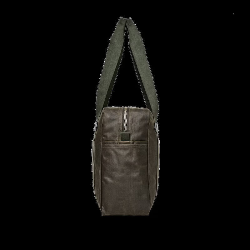 Filson’s Tin Cloth Zipper Tote Bag features the brand’s legendary oil finish Tin Cloth for great water-resistance to protect your gear. The waxed cotton canvas from British Millerain is thoroughly saturated with proprietary oil finish to create a barrier to prevent rain and snow from seeping through inside and keeping them on the outside.