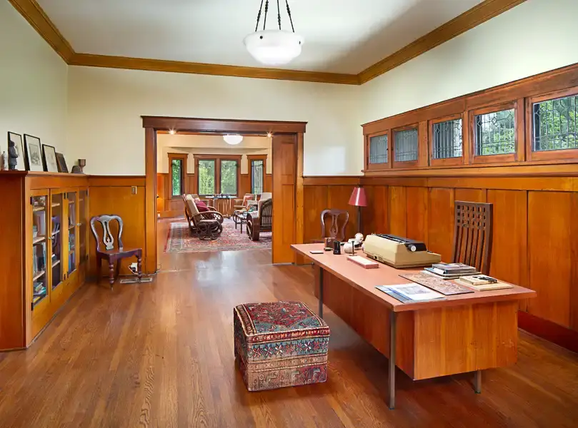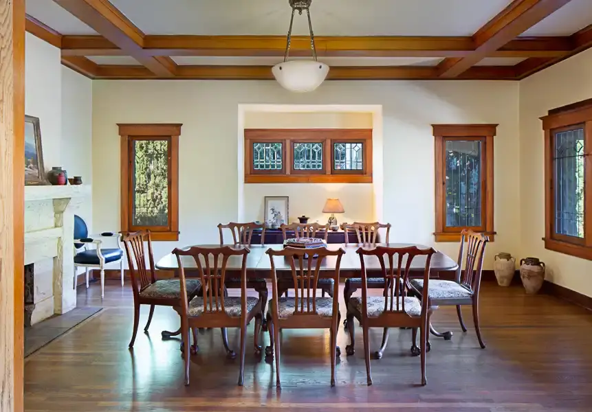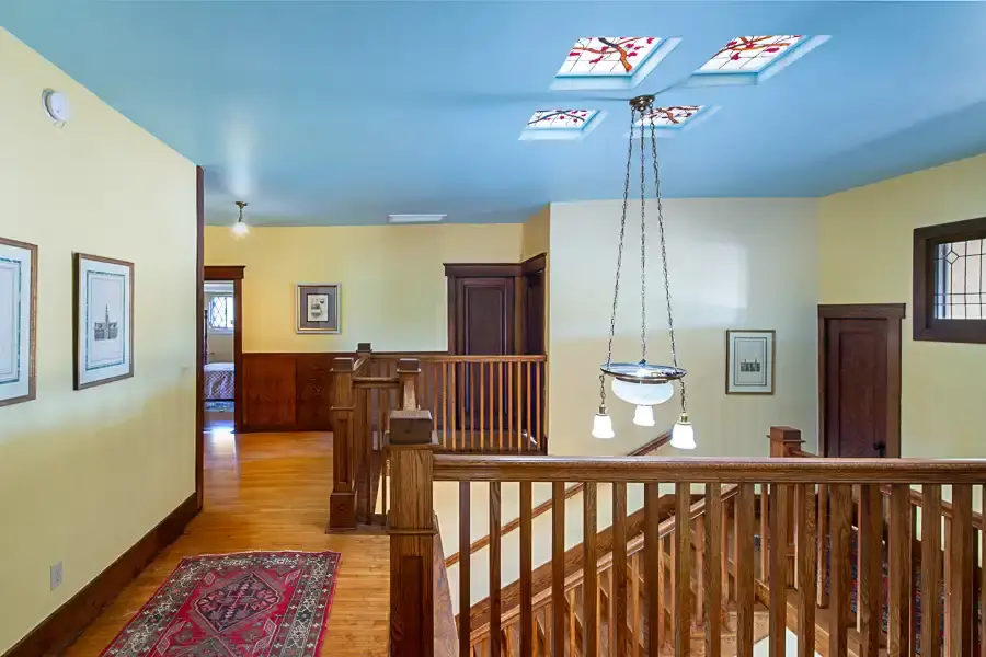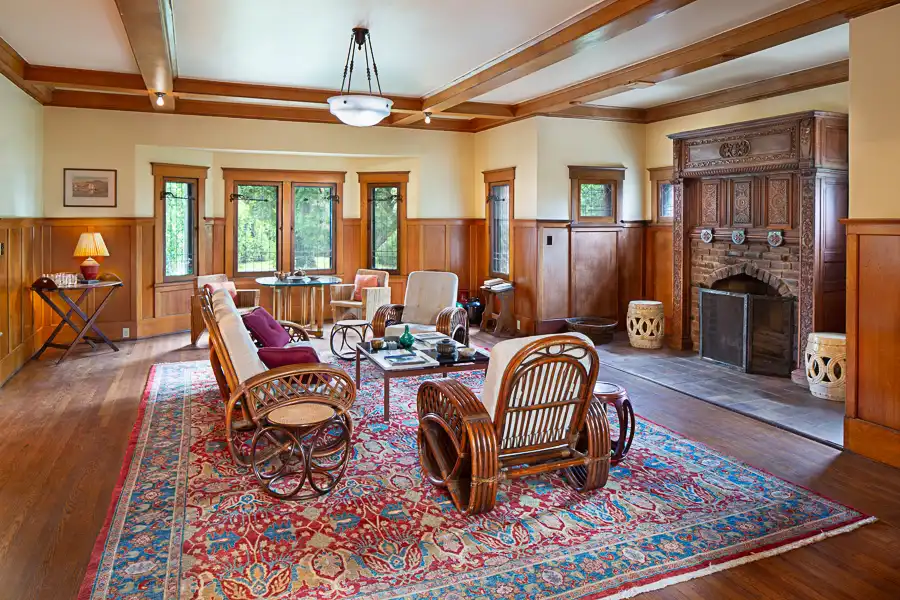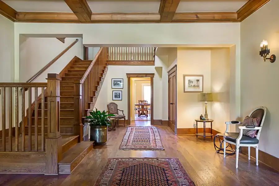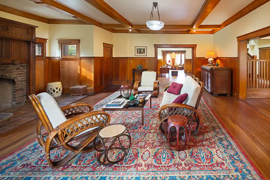 As described by the official listing, it “is one of the largest landmarks in the neighborhood and miraculously has retained much of its original historic fabric. Formal entry, wainscoting, coffered ceilings, large pocket doors between rooms and two hand-carved fireplaces can be found on the first floor.”