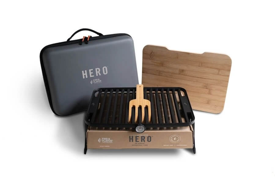 The Fire & Flavour Hero Grill is small for its functions. It only measures 4.5″ x 11″ x 15″ and comes with a bamboo spatula and a food-safe bamboo cutting board for the complete grilling experience in the outdoors. This grill doesn’t look like your typical portable grilled at all especially when stored in its PACKTIGHT carrying case.