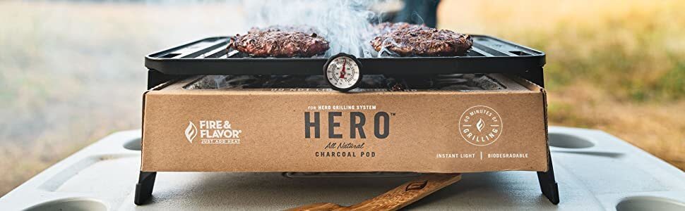 This premium portable grill is meant to make charcoal grilling simple and mess-free. It doesn’t require a charcoal bag and lighter fluid. It has its own full-grilling system that includes a disposable charcoal pod equipped with a biodegradable, low VOC charcoal. The charcoal lights up fast in under 10 minutes and provides an hour of grilling power. It also distinguishes easily with water.