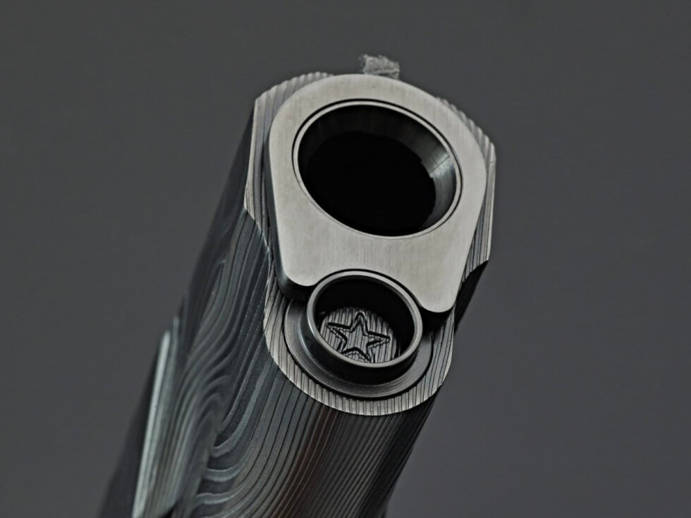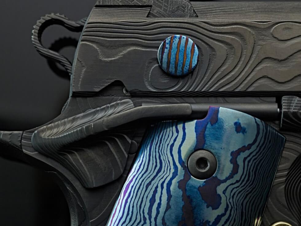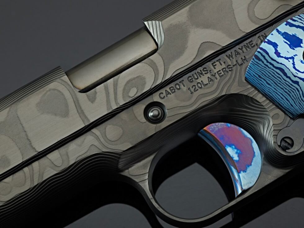 Meanwhile, that gorgeous interplay of light you see there comes from a special blend of artisan-forged steel and titanium called Damascus Titanium. The mixture of the metals creates a damascene pattern that weaves along with a blueish shade on the grips and triggers. To top it all off, the front and rear sights are crafted out of a 4.5 billion-year-old meteorite. Finally, the magazine release sports a blue sapphire gemstone. The Cabot Guns Fire & Ice is a custom set of firearms that arrive in a hand-crafted case made by Marvin Huey.