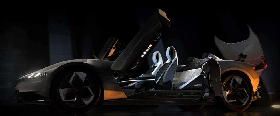 The Ronin features a cockpit dominated by a massive 17.1” infotainment system with sustainable materials for various elements of the interior. Its retractable roof is crafted out of carbon fiber as well as the 23” rims. Finally, there’s enough room to comfortably seat five.