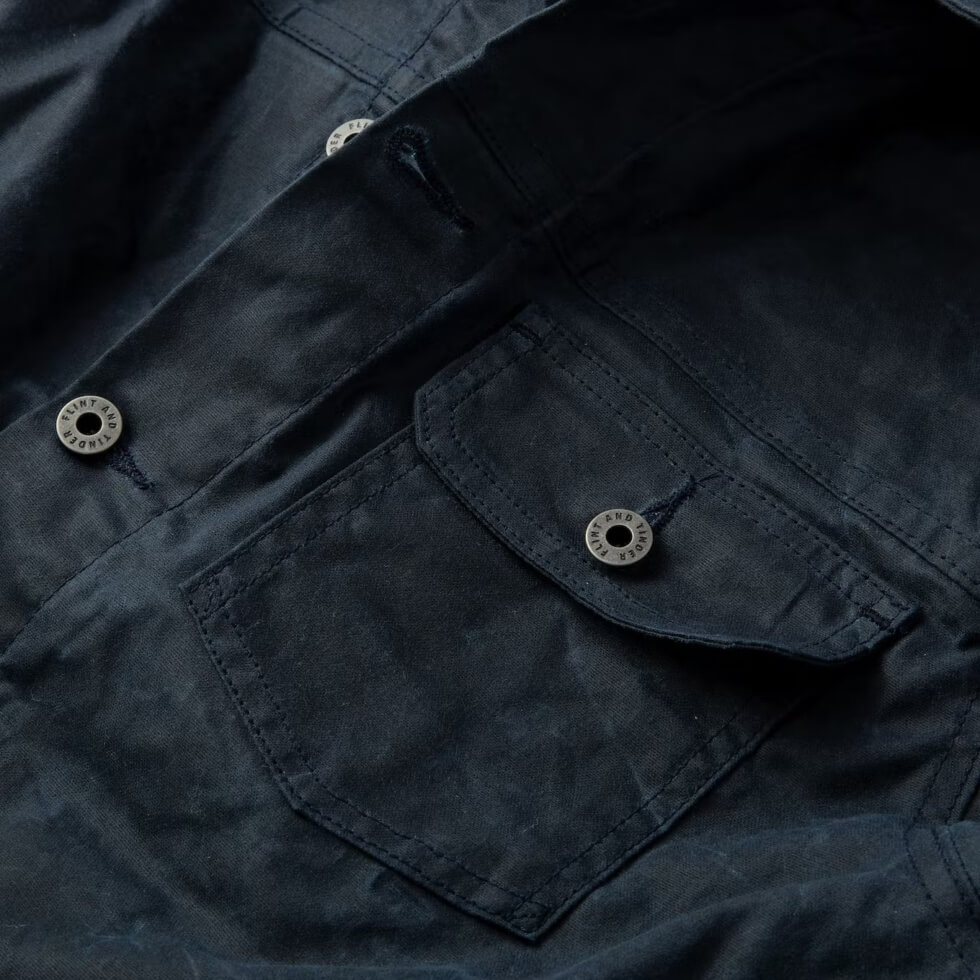 Over time, the creases form unique patterns on these bad boys. Flint and Tinder opts for a button closure instead of a zipper for the Waxed Trucker Jacket. There are three outer pockets with an interior media pocket as well. The quality and craftsmanship are exceptional and we recommend a couple for your wardrobe.