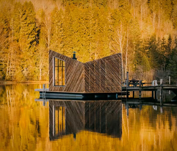 Located on the picturesque Halden Canal in Norway, the Flo Floating Cabin offers an unforgettable getaway surrounded by wilderness. It has a comfortable 323-square-foot interior that hosts a bedroom and a sitting area with a wood-burning stove.
