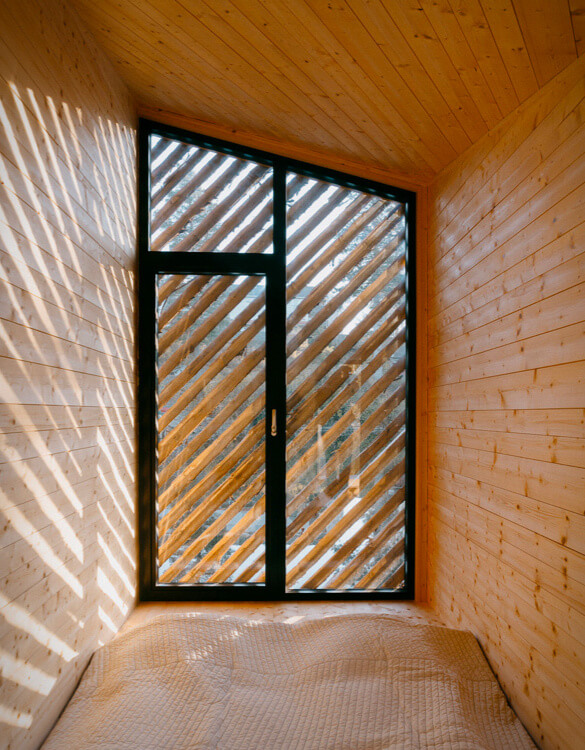 This unique off-grid micro-cabin features a rectangular base that rests on a floating element. It also has a reverse-pitched roof that adds a touch of elegance but also guides your views toward expansive beautiful scenery.