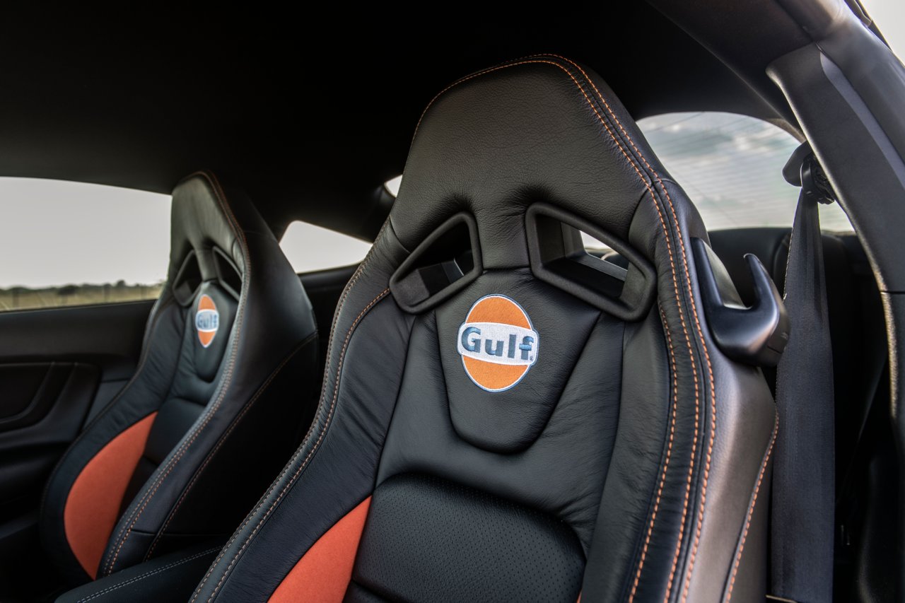 The car, an officially licensed Gulf Oil product, features the classic orange and blue livery and comes bedecked in Gulf motifs all over. The front fenders have it, for starters. So does the rear valence, the seatbacks, and the numbered authenticity plaques.