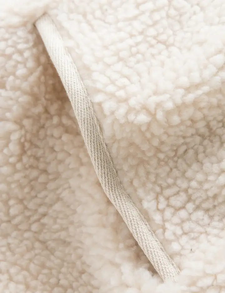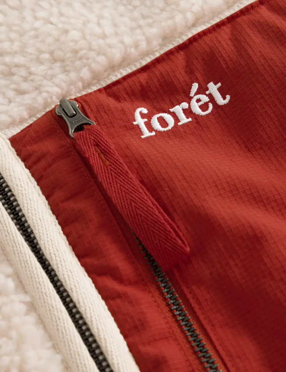 Jackets made from sherpa are incredibly warm and they insulate well without being heavy or bulky. They also wick moisture and dry quickly, which makes them easy to clean. In this case, Forét Studio crafted their jacket in a natural-hue sherpa with a contrasting red ripstop pocket on the chest to store everyday carry valuables. YKK zippers with a red pull tab for easy closing and opening adorn the pocket.