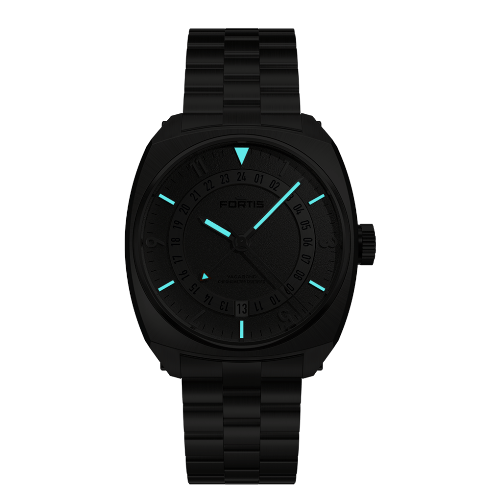 Directly above 6 o’clock is a date aperture forming a gap in the 24-hour GMT ring. Next are the metallic hours, minutes, seconds, and GMT hands. For low-light legibility, Fortis applies SuperLuminova X1 on the necessary components for accurate timekeeping. Meanwhile, the Vagabond V-40’s GMT hand sports a vibrant orange tip.