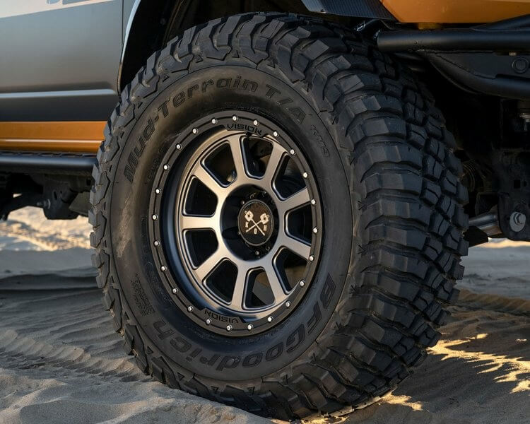 Next up are the steering sleeve kit, LCA skids, lower shock skids, and a tire clearance kit, all from JKS. Finally, there are the FOX Performance Elite 2.5 Series shocks. According to the KOH Bronco press details, it rides on 18” satin gray Vision Ojo wheels with Tire Lock Technology. These are shod in 37” BFGoodrich Mud-Terrain KM3 tires for reliable traction and grip.