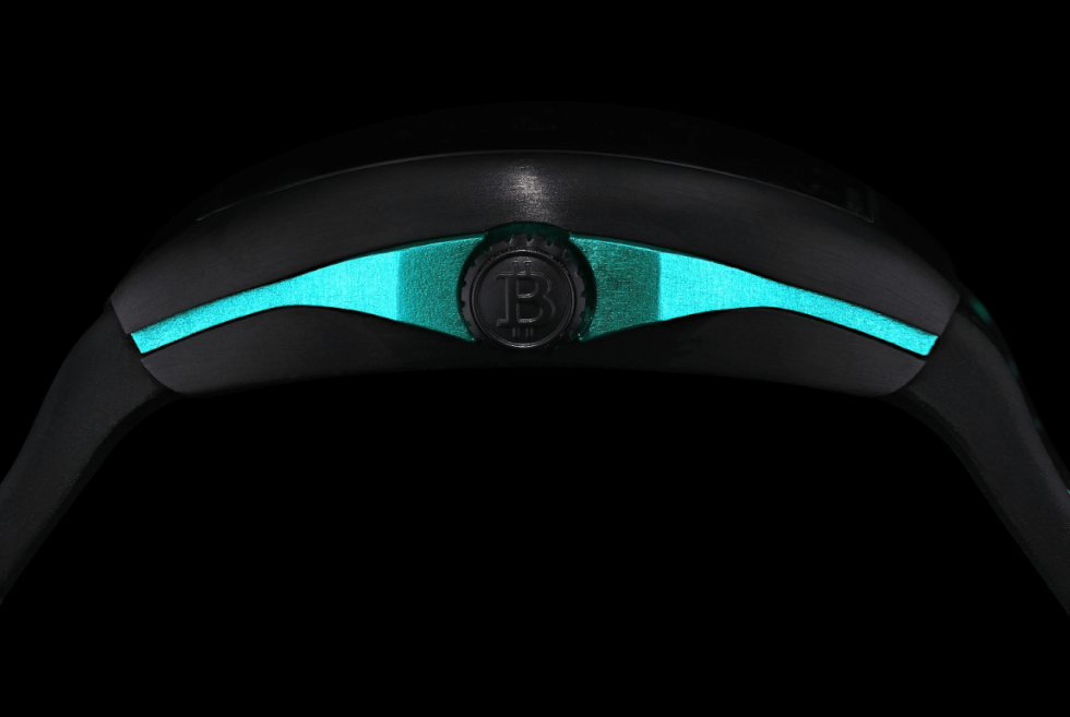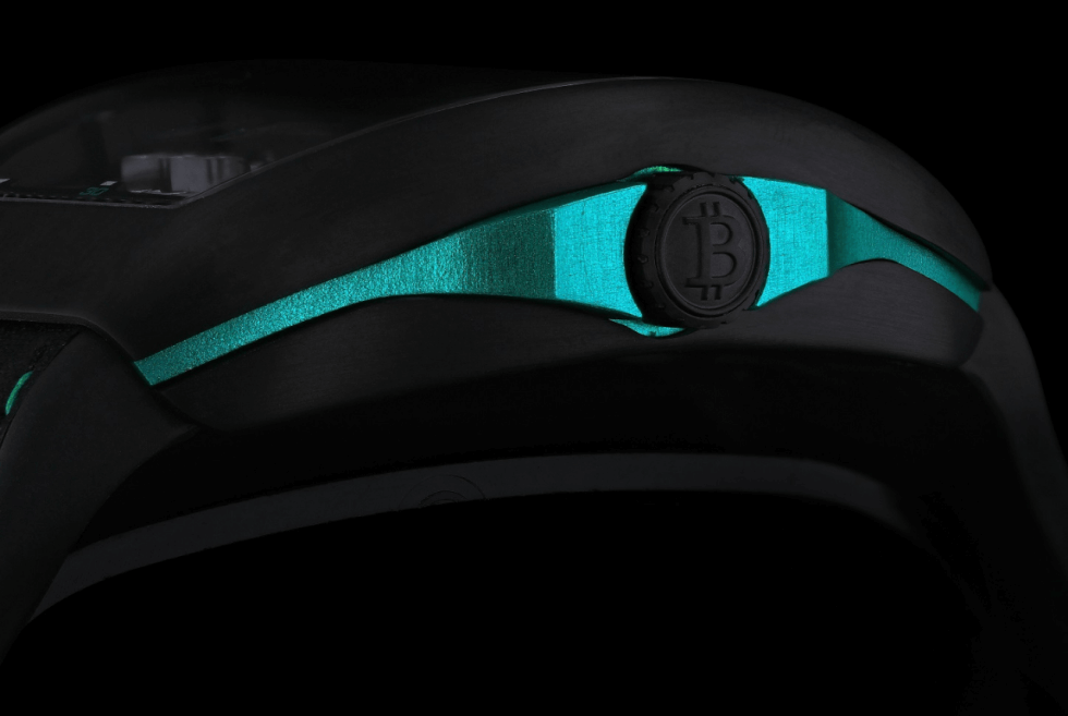 It comes with a 41 mm tonneau case crafted out of titanium. Also, the watch features a brushed finish in black DLC with a hint of green on the caseband. This colorway continues on the sporty perforated leather strap in black with green stitching. A Bitcoin Symbol can be seen on the crown.