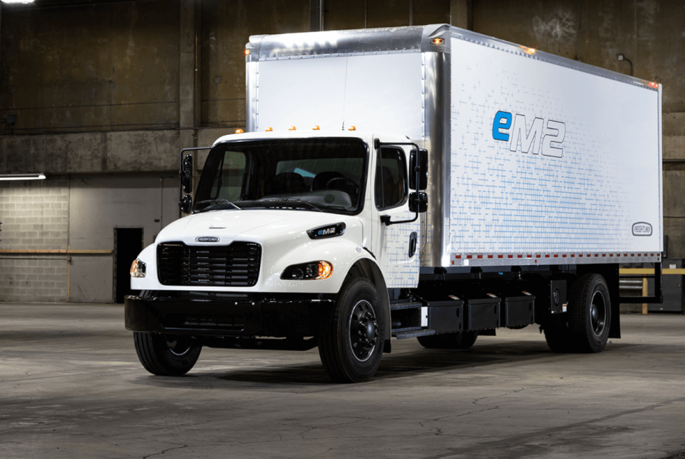 First up is the eM2 which the marque describes as an electric medium-duty. Transportation regulators would identify it as a Class 6-7 commercial box truck. Meanwhile, the eCascadia is Freightliner’s Class 8 on-highway tractor-trailer. The former outputs 180 to 300 horsepower and promises a range of about 230 miles on a full charge.