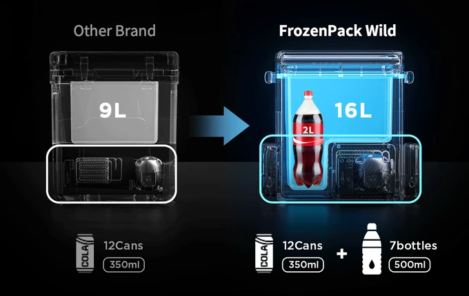 As for its cooling power, the FrozenPack Wild operates quietly at just 37dB even during rapid chill, in which the temperature drops from 77°F to 32°F* in just 15 minutes. This way, you can enjoy ice cold drinks right away or preserve that freshly caught salmon. A sealed design coupled with a high-performance external U20 Battery Ultra ensures contents stay cold for up to nine hours. Its triple-layer insulation retains the cold even after the power is off.