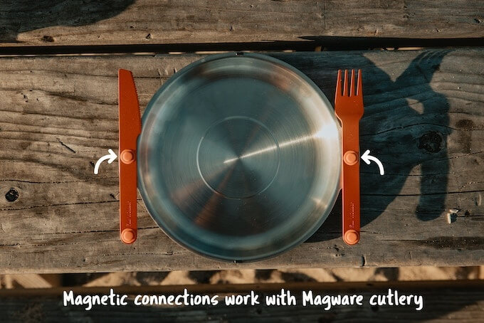 Best of all, the magnets on the Magware 2.0 set work with the Magware Magnetic Cutlery. They attach to the sides of the bowls and plates enabling you to carry the cutlery with ease when you do not have any spare hands free. They also keep the fork, spoon, and knife within easy reach and away from dirty surfaces.