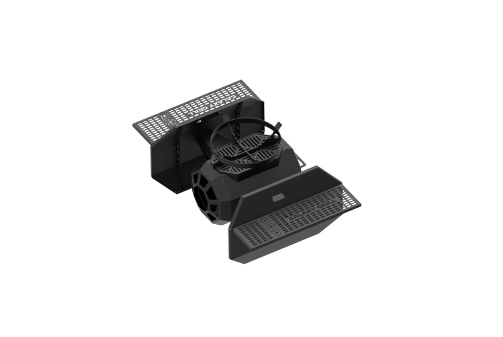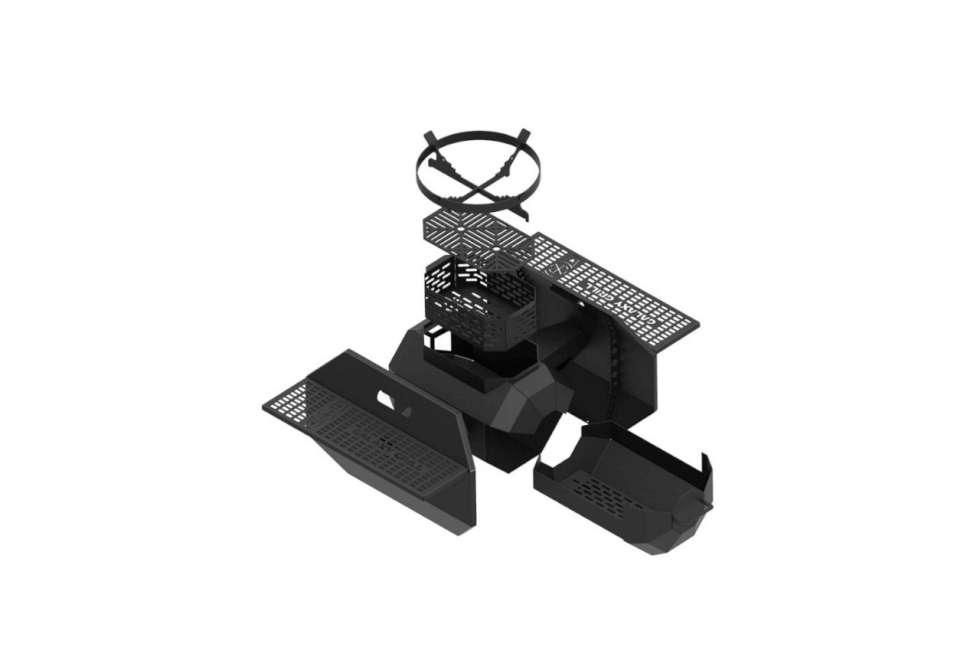 The Galaxy Grill uses steel with a black heat-resistant coat with a matte finish, There are two fold-down side shelves – one for each wing. The cockpit holds the wood/charcoal. Which looks totally awesome when lit by the way.