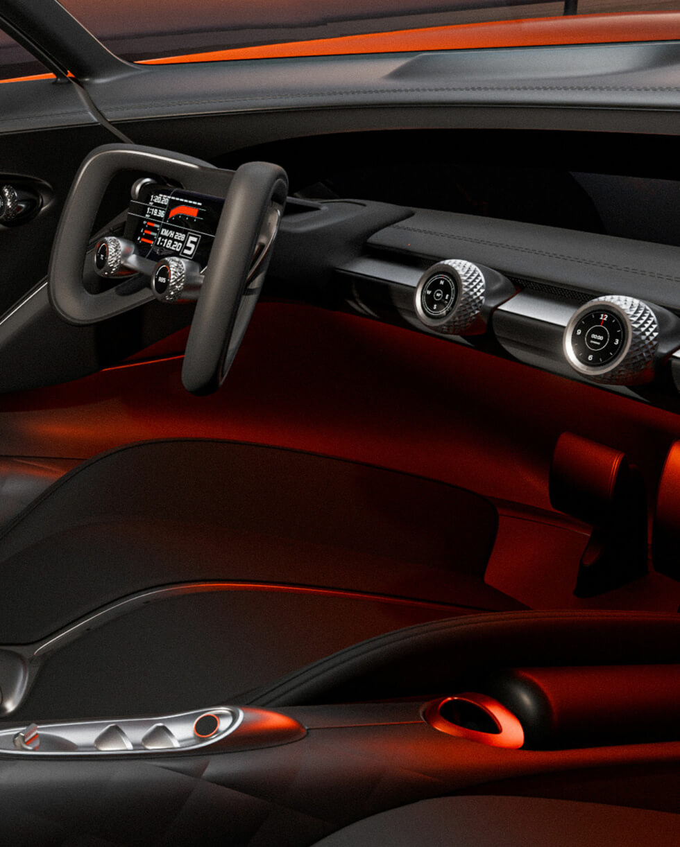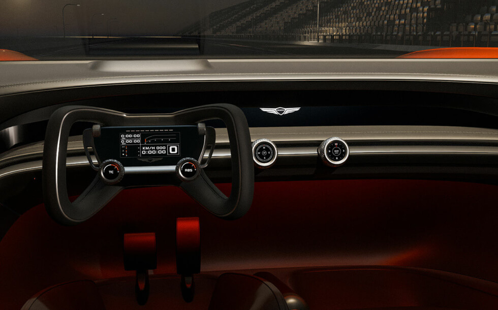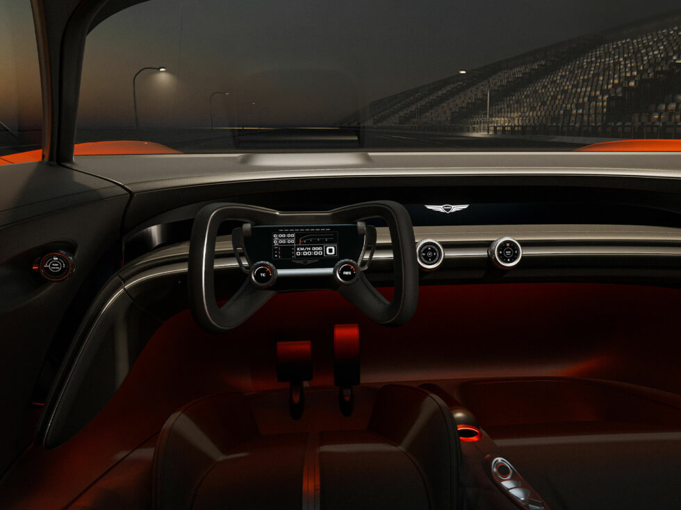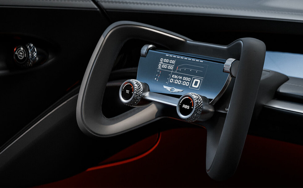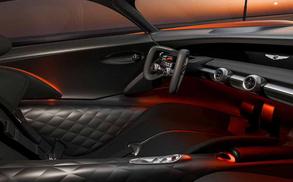 Racing seats and multi-point harnesses anchor you securely while you grab the aviation-inspired steering yoke with an integrated digital instrument display. The Genesis x Gran Berlinetta VGT dashboard is utilitarian save for the illuminated Genesis logo dead center. Diamond-pattern leather upholstery adorns most of the surfaces and metallic hardware accents add to its luxurious appeal.