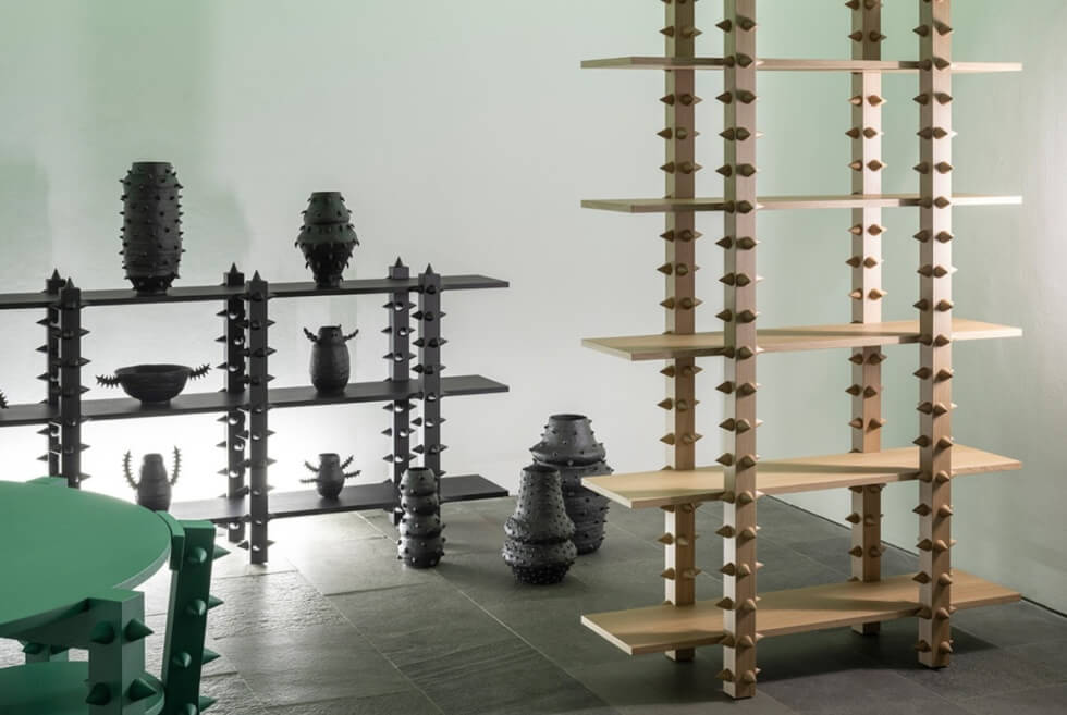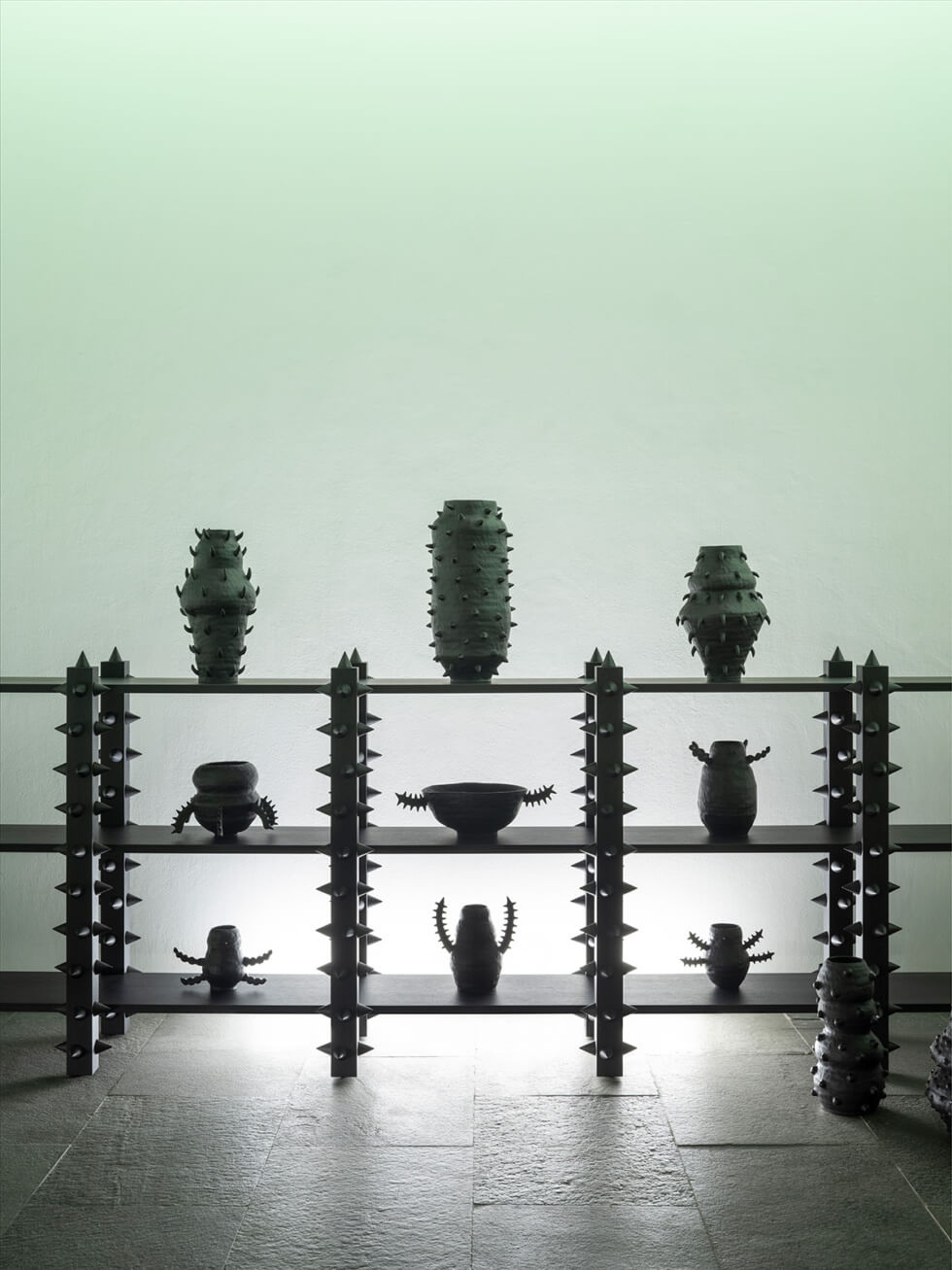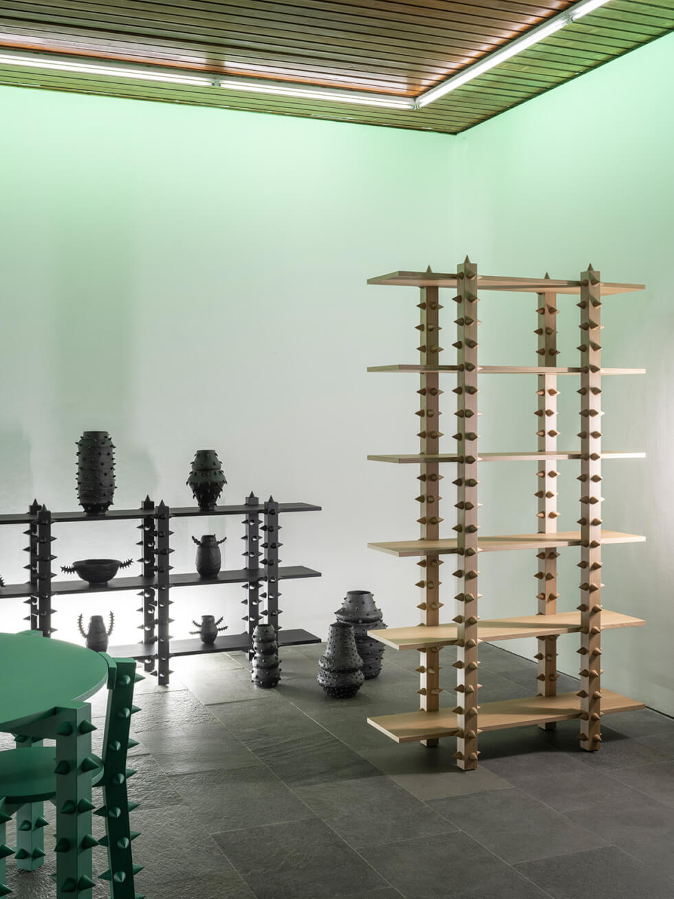 The CEIBA furniture collection is a collaborative exhibition in Geneva with Swiss-Argentinian ceramist Ángeles Rodríguez, whose collection of spiky ceramics complements his furniture. The series, called SOMBRA, includes bowls and vases of varying shapes and sizes crafted from black sandstone. The collaborative project celebrates a shared exploration of materiality and form found in nature.