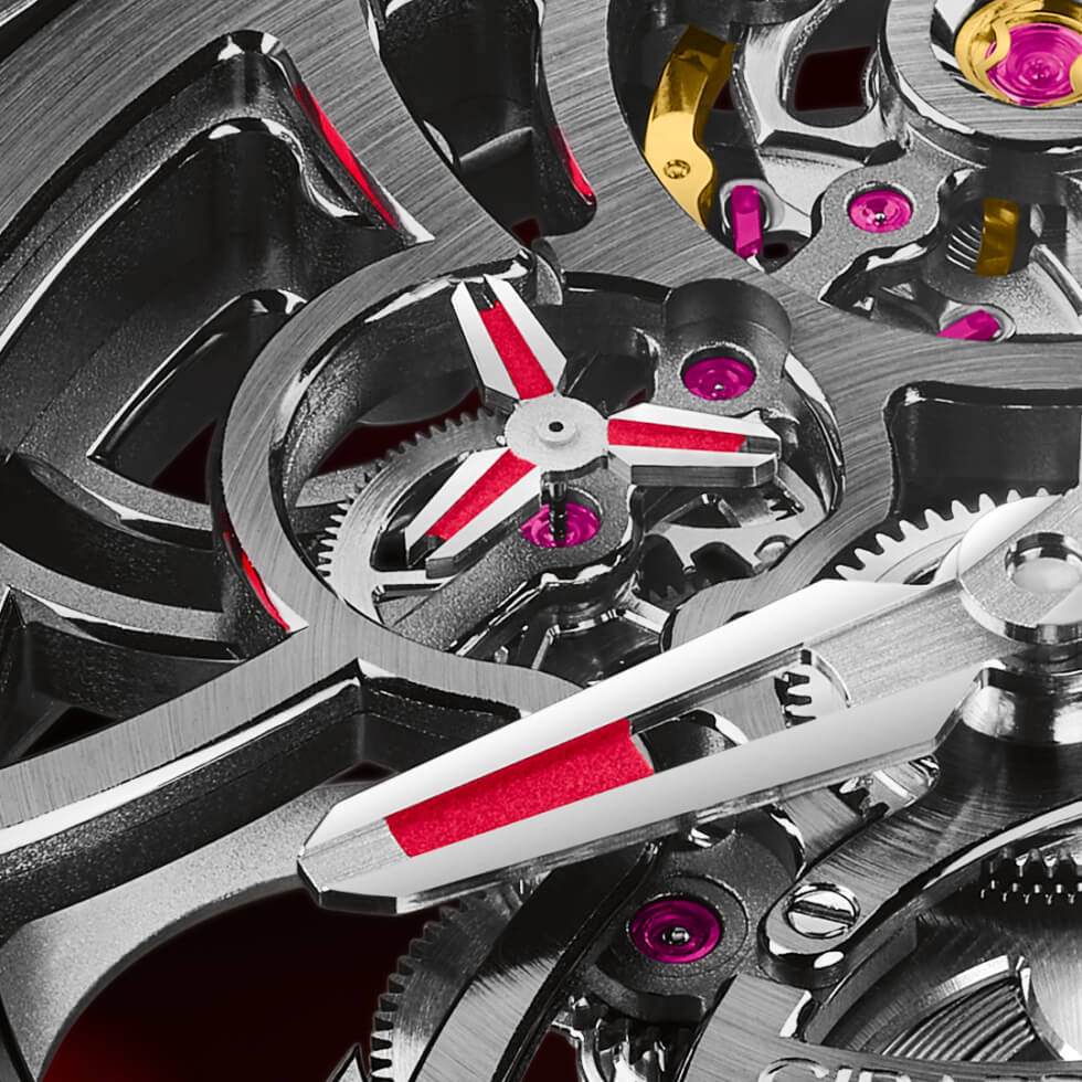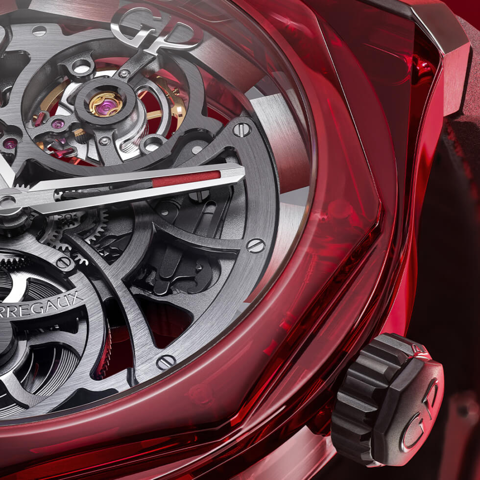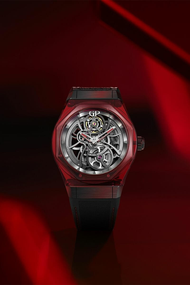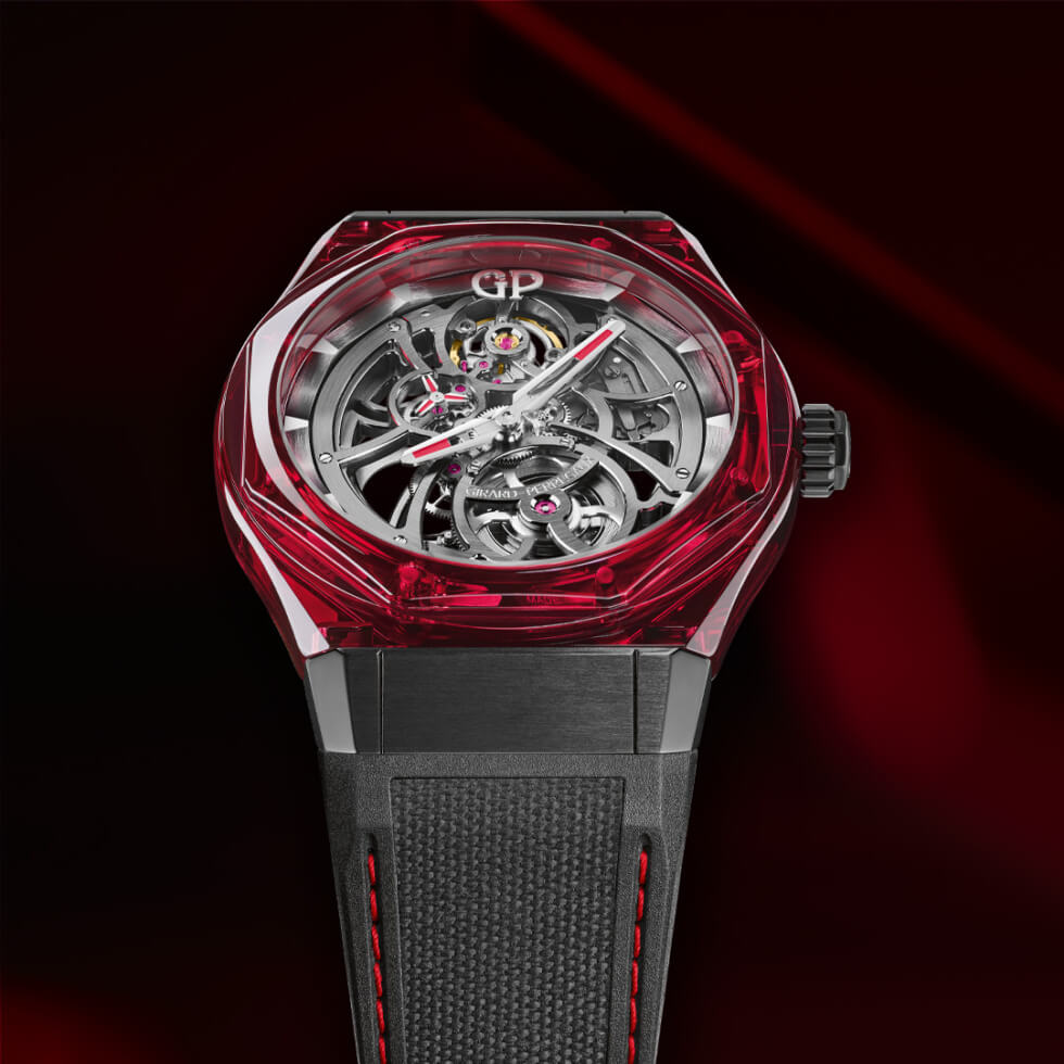 Finally, there is the tribute to this year’s Lunar New Year in YAG (a polycrystalline material similar to sapphire but in a deep red hue). The housings measure 44 mm x 11.56 mm and feature a skeleton dial. The Laureato Absolute Light lineup relies on an in-house GP01800 automatic caliber with a 54-hour power reserve. Each sports a rubber strap with a titanium folding buckle closure.