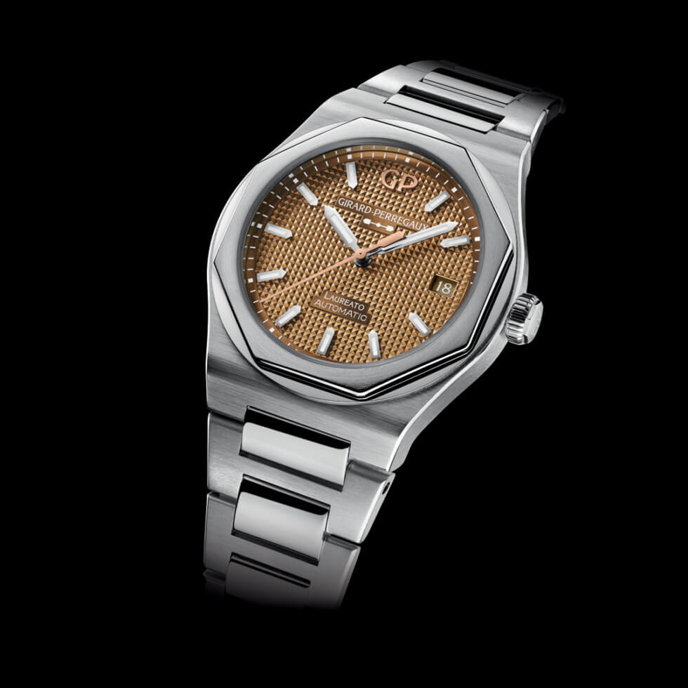 Other elements include the applied hour markers, copper minute track, a date window at 3 o’clock, and the GP emblem at 12 o’clock. Finally, Girard-Perregaux outfits the Laureato with a steel bracelet that uses a triple folding buckle closure.