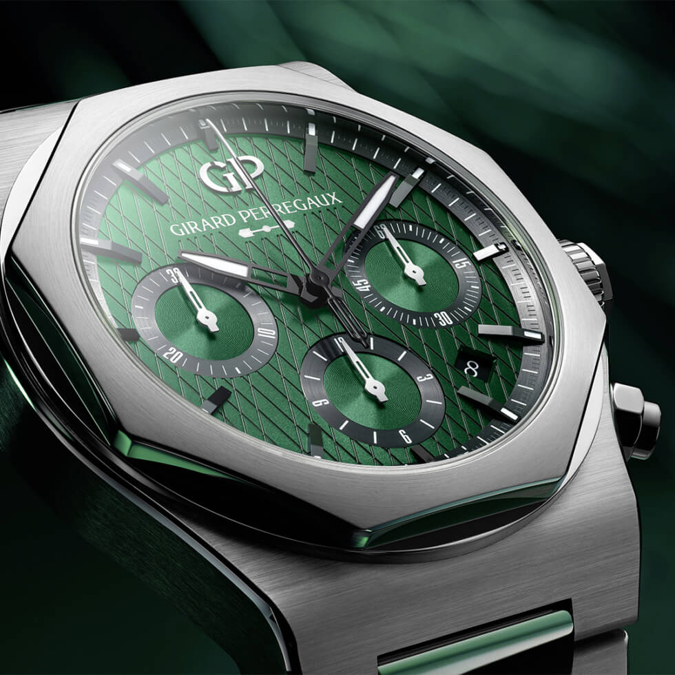The Girard-Perregaux Laureato Chronograph Aston Martin Edition then uses dark gray on the minute track, hour markers, hands, and the outer rings of the sub-dials. The sunray finish of the latter produces a dynamic effect when you move it around. Only 188 examples of this elegant timekeeping instrument will be available.
