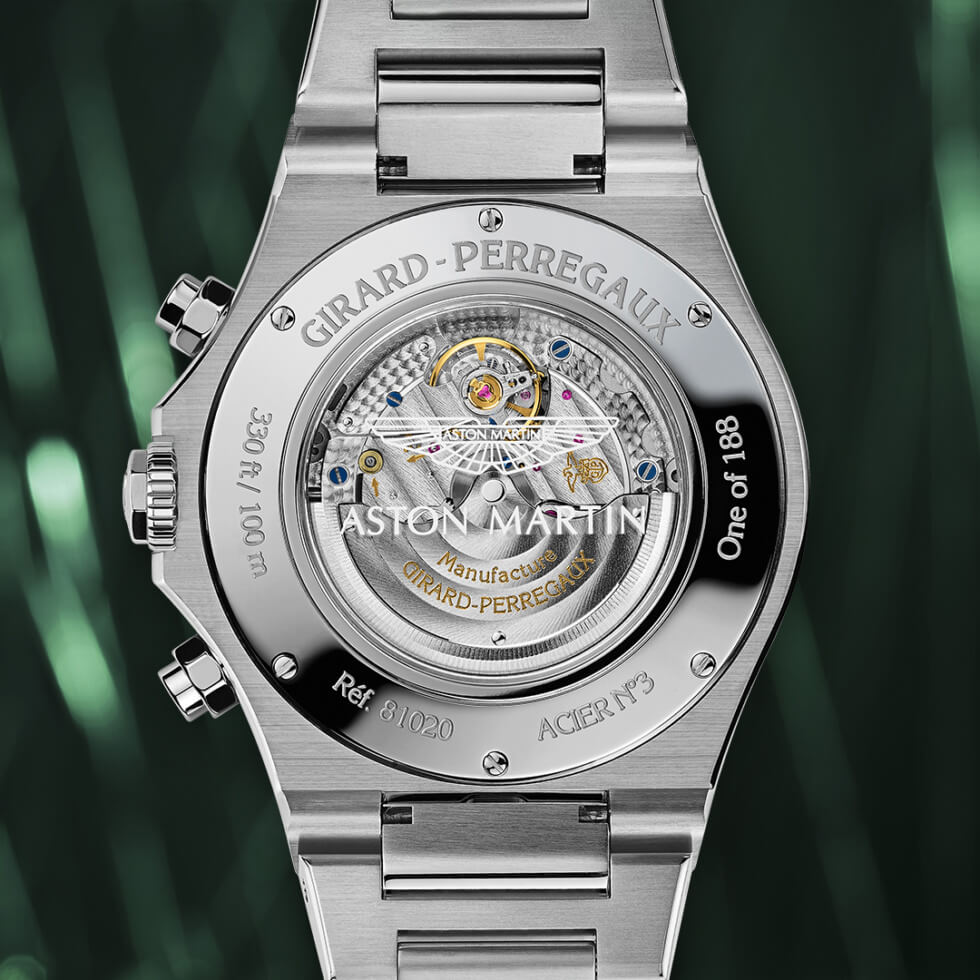 Girard-Perregaux makes this element the highlight of the timepiece. No precious metals here as the Laureato Chronograph Aston Martin Edition uses 904L steel for its 42-mm case. It is paired with a bracelet – also crafted out of 904L steel – with a triple-folding buckle closure.