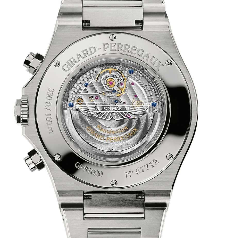 Flip the Laureto Chronograph Aston Martin Edition for a glimpse of its exhibition case back and the metalized Aston Martin logo on the sapphire crystal window. Inside is the Calibre GP03300 self-winding chronograph movement. Also, the automatic mechanical manufacture boasts a 46-hour power reserve and is comprised of 419 components with 63 jewels.