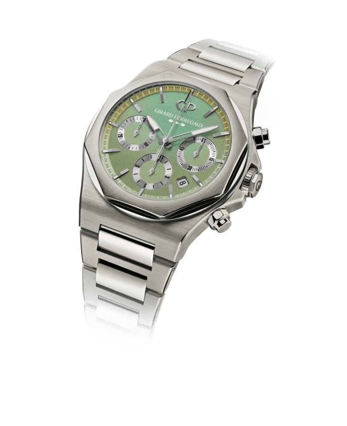 Here is a 42 mm x 12.16 mm titanium case which dazzles with a combination of satin and polished finishes. Framing its iridescent green dial is a fixed octagonal bezel and a sapphire crystal. Three chronograph counters with decorative sunray finishes are arranged at 3 o’clock, 6 o’clock, and 9 o’clock.