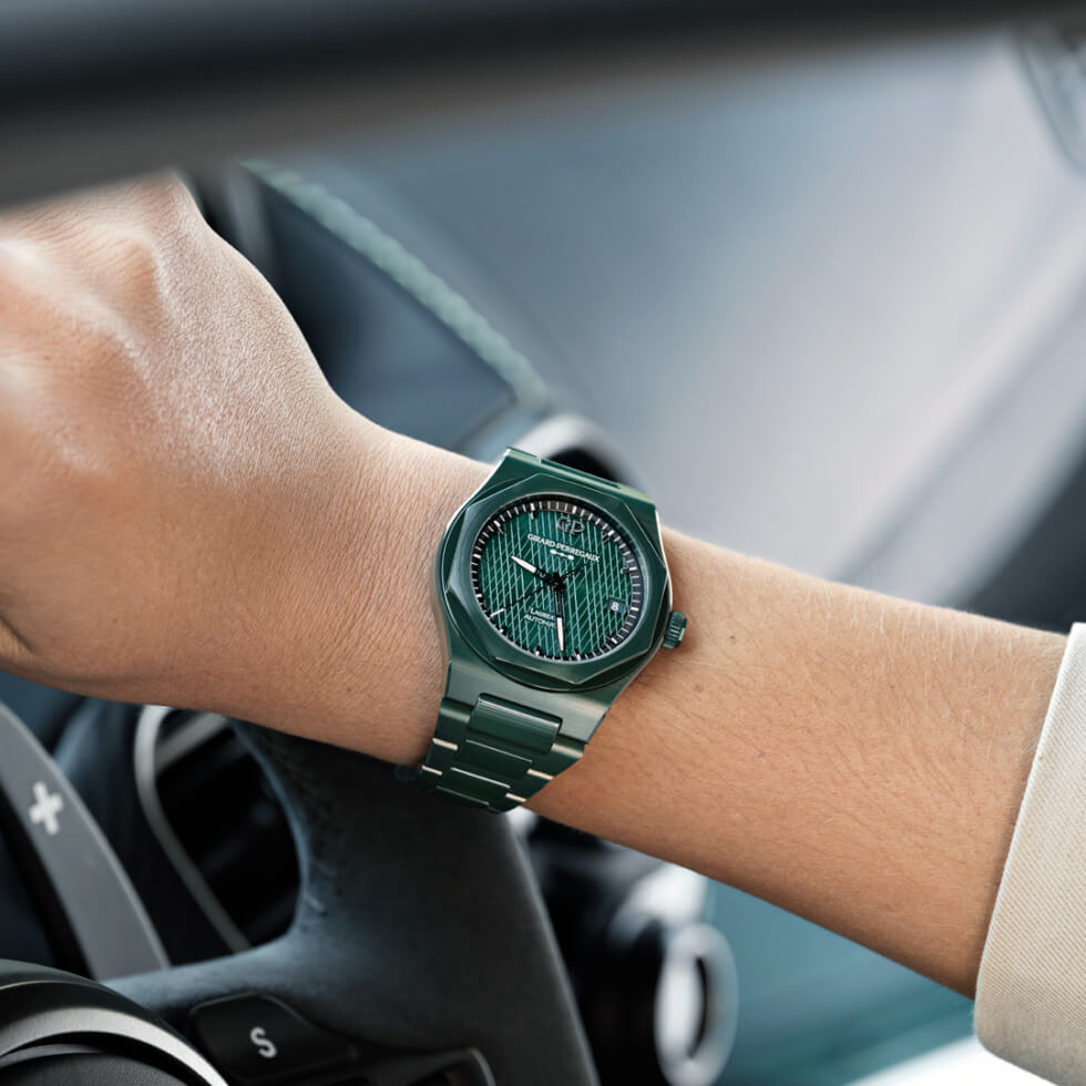 If you’re an avid horological enthusiast, the Laureato Aston Martin Edition probably reminds you of the Royal Oak silhouette. Interestingly, many consider it an elegant alternative to what Audemars Piguet offers. Girard-Perregaux constructs the case out of green ceramic which measures 42 mm x 11.08 mm and 38 mm x 10.27 mm respectively.
