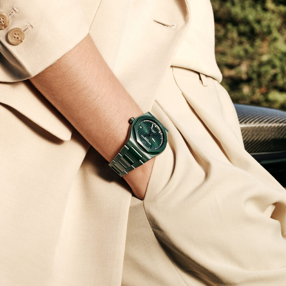 The 42 mm Laureato Aston Martin Edition runs on a GP01800 self-winding movement with a 54-hour power reserve. Meanwhile, the 38 mm is powered by a GP03300 automatic caliber with a 46-hour power reserve. Completing the tonal theme of the watches is a green ceramic bracelet.