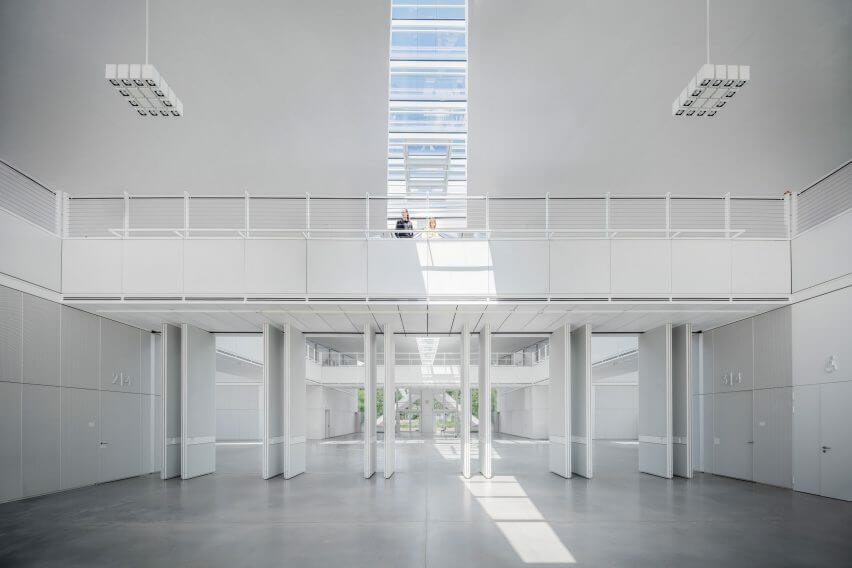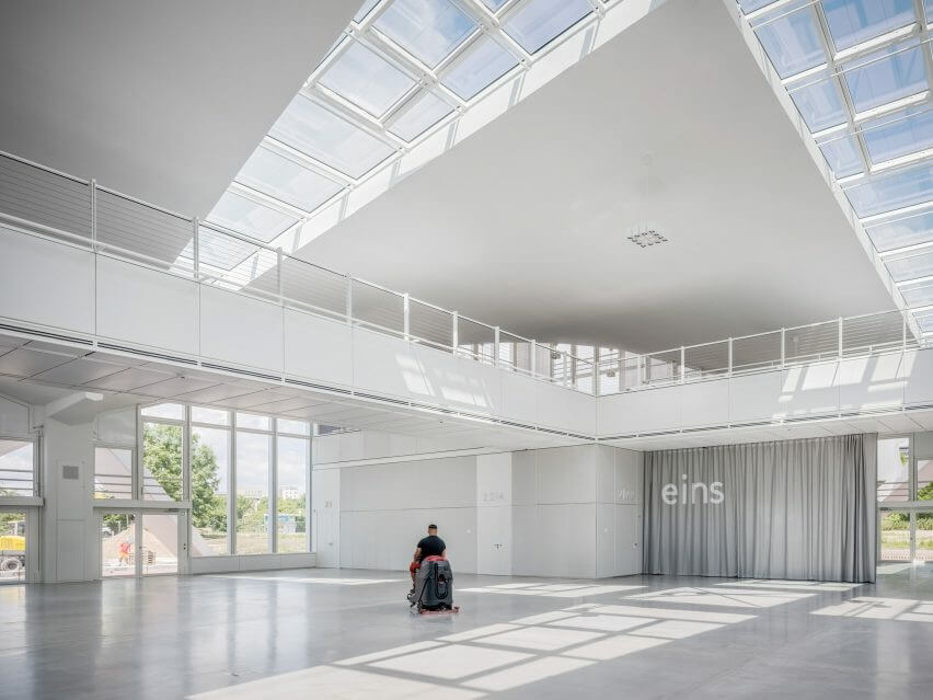 GMP Architekten built the new internal structures from steel according to the building’s original design. They then aligned these cubes with the building’s square grid layout and connected them via a network of raised bridges. These bridges offer circulation across the upper floor, while partitions serve to divide the ground floor spaces.
