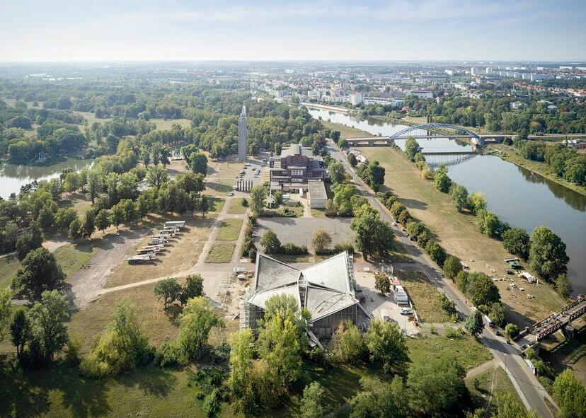 GMP Architekten has completed the renovation of the post-war Hyparschale Hall in Magdeburg, Germany, which sits alongside the Elbe River within a large park. It is one of the many shell-roofed structures designed by Ulrich Müther in the late 1960s featuring four hyperbolic paraboloids arranged into a square and is the largest of Müther’s building designs saved from demolition. The building was spared after it was listed as a historic monument in 1998.