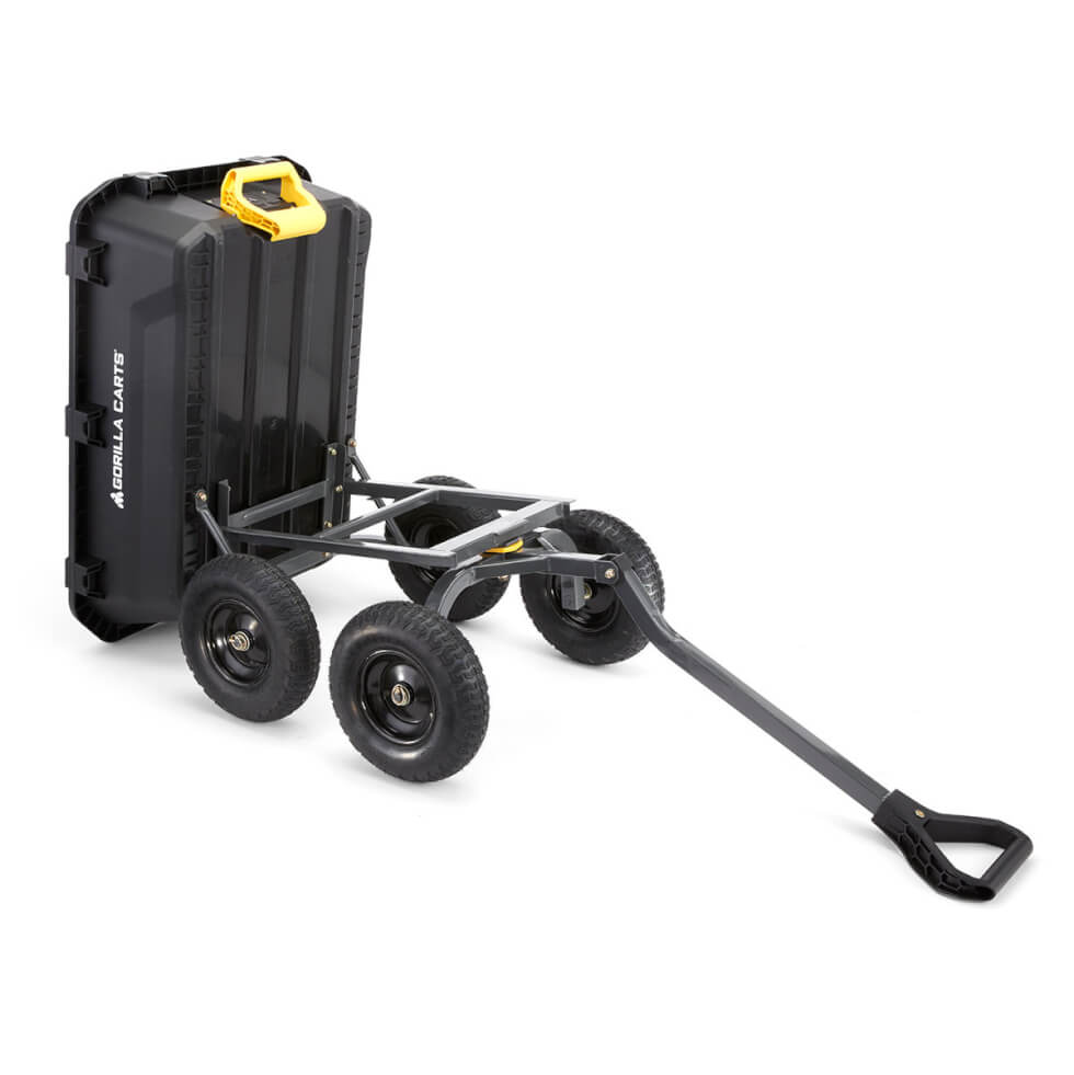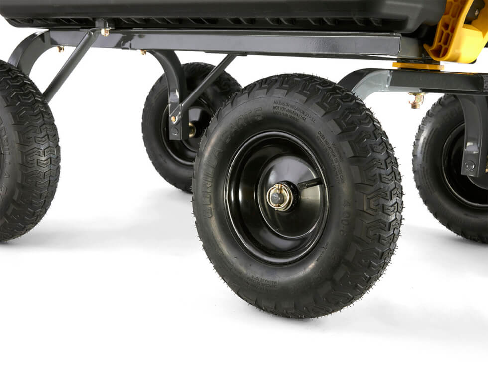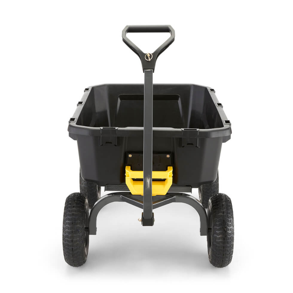 The Gorilla Carts Yard Dump Cart can handle chores on any terrain with its balanced and extra-wide base. Plus, it features four stable wheels and 13-inch pneumatic tires which are commonly used outdoors. This lets you haul the cart on any landscape with minimal bumping and shaking. These tires usually also have a thicker thread to provide traction on a loose or uneven surface. The addition of a patented 2-in-1 convertible handle allows the cart to be towed behind an ATV or lawn tractor for freedom in the maneuvering. Or you can easily just pull it by hand.