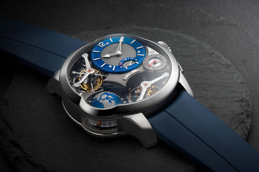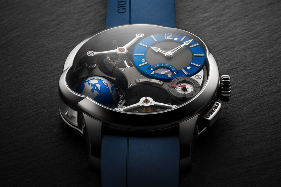 The integrated 72-hour power reserve indicator of the GMT Quadruple Tourbillon is in the same color. A slightly different shade is likewise visible on the rotating globe wherein it represents the bodies of water against the gray landmasses of the continents.