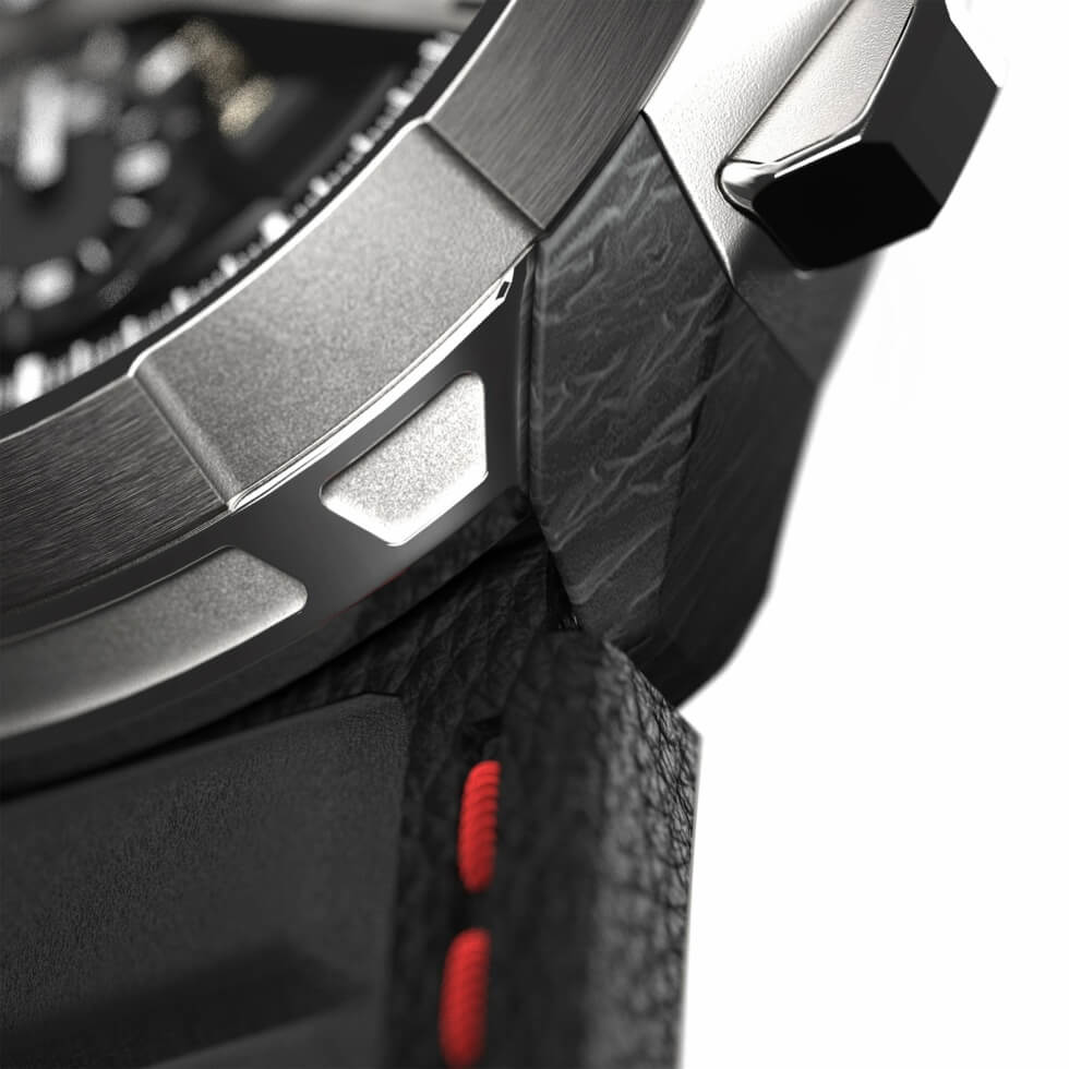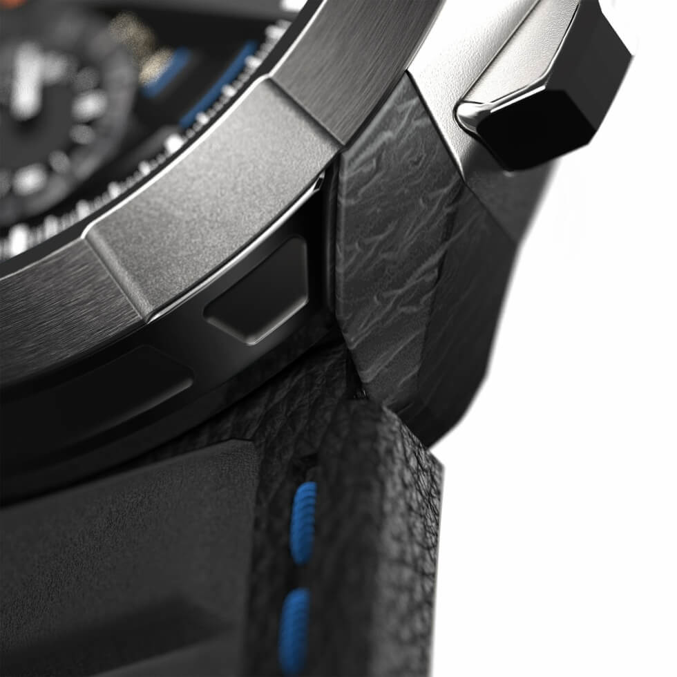 Both tout a 44-mm 6-piece case construction that predominantly uses a 316L stainless steel construction. Some sections sport a black PVD coat with a mix of brushed, sandblasted, and polished finishes. Meanwhile, the caseband and lugs are forged carbon fiber — both new and from the roof of Gunther Werks’ restomods.