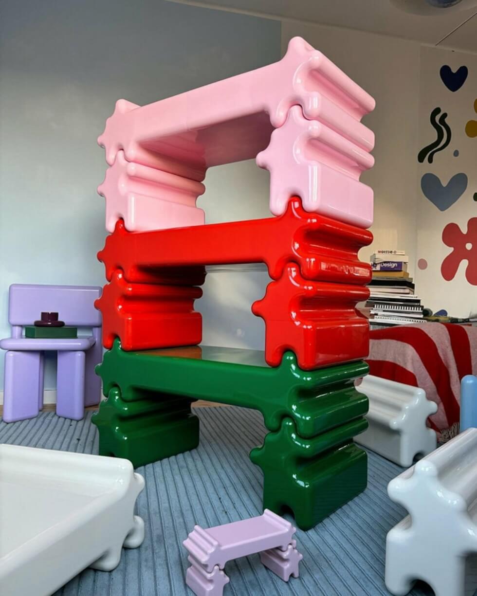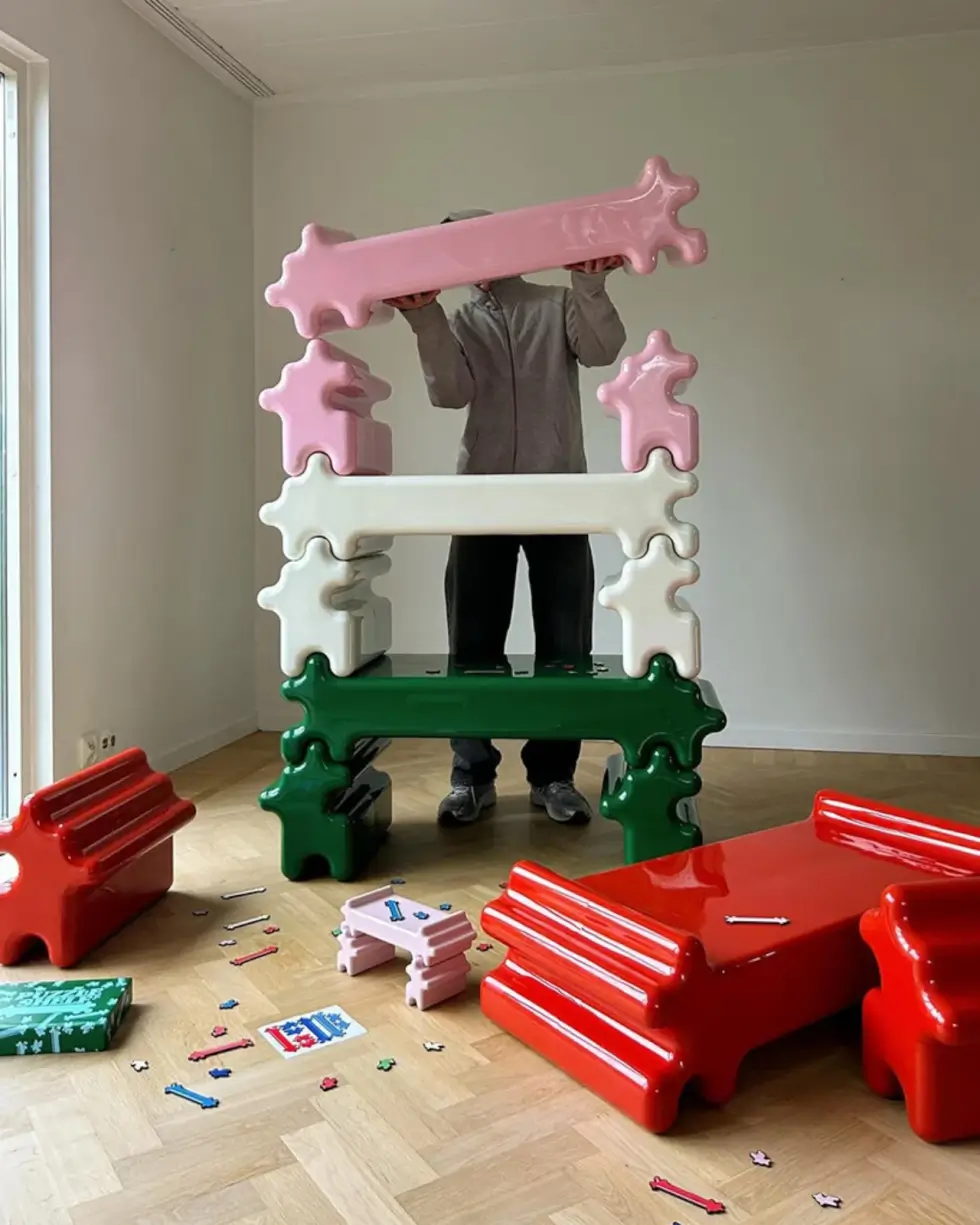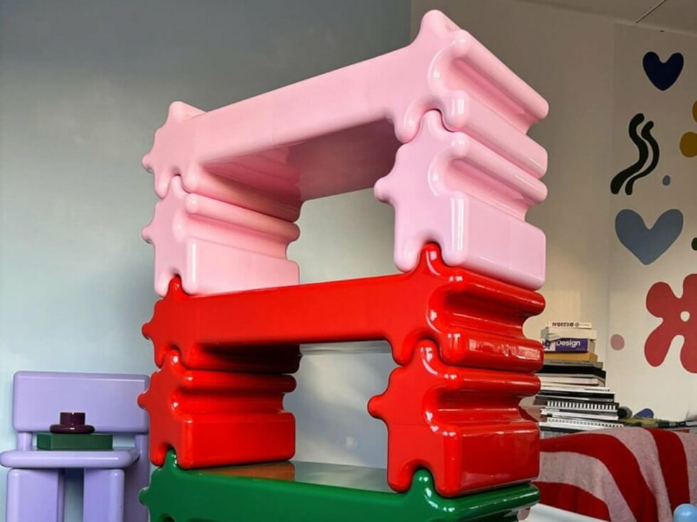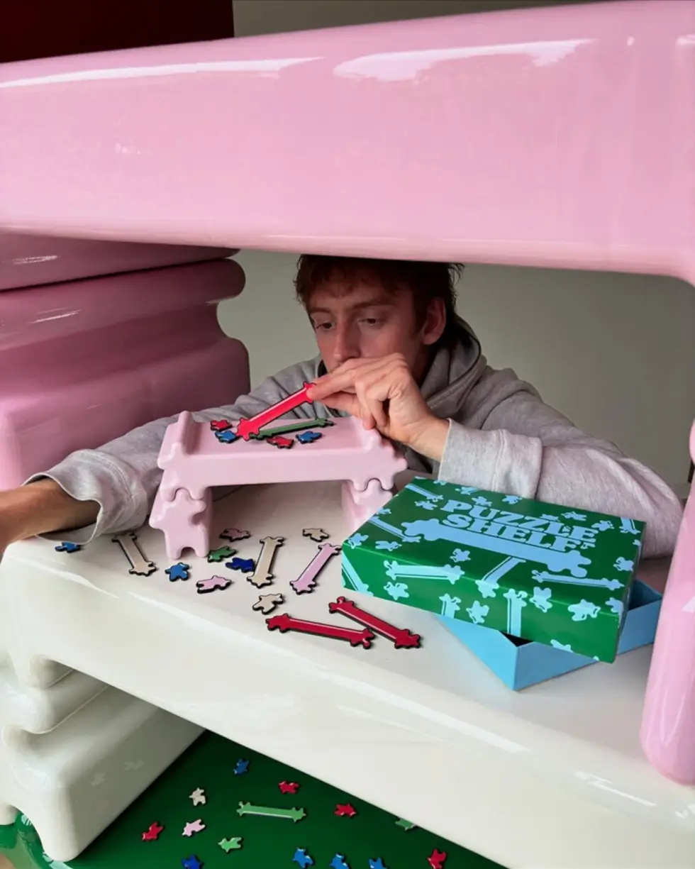 Swedish designer Gustaf Westman makes bold, fun, colorful, chunky, and quirky everyday pieces from tumblers, plates, planters, stools, and more. His creations stand out and make great conversation starters in any interior setup. His latest creation, the Puzzle Shelf, invites playful interaction and creates social connection.